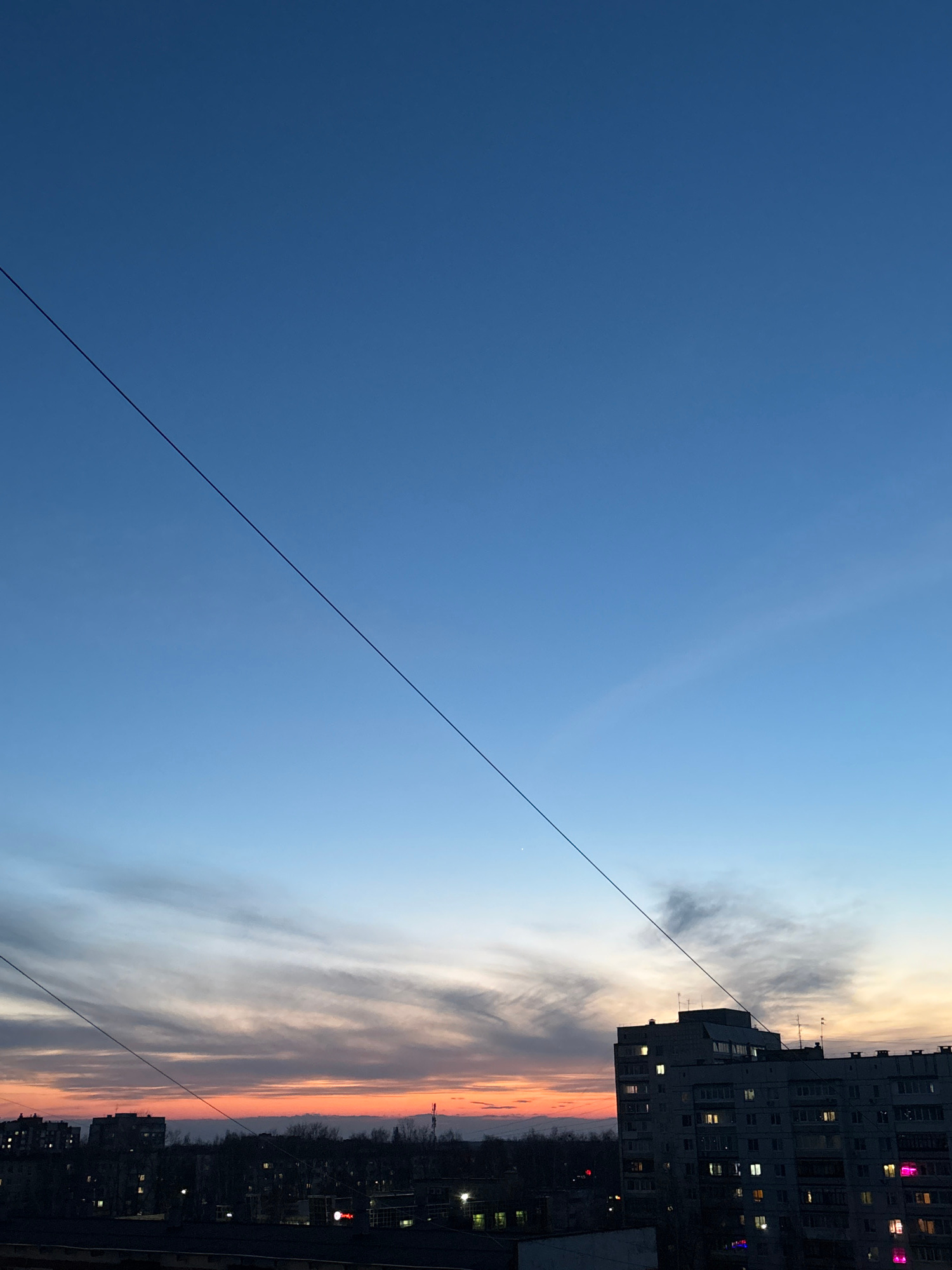 The image depicts a view of the sky during a sunset in the city of Chaikovsky, Russia. The sky transitions from a deep blue on the left to a lighter blue and then to orange and pink hues on the rightβ¦read more