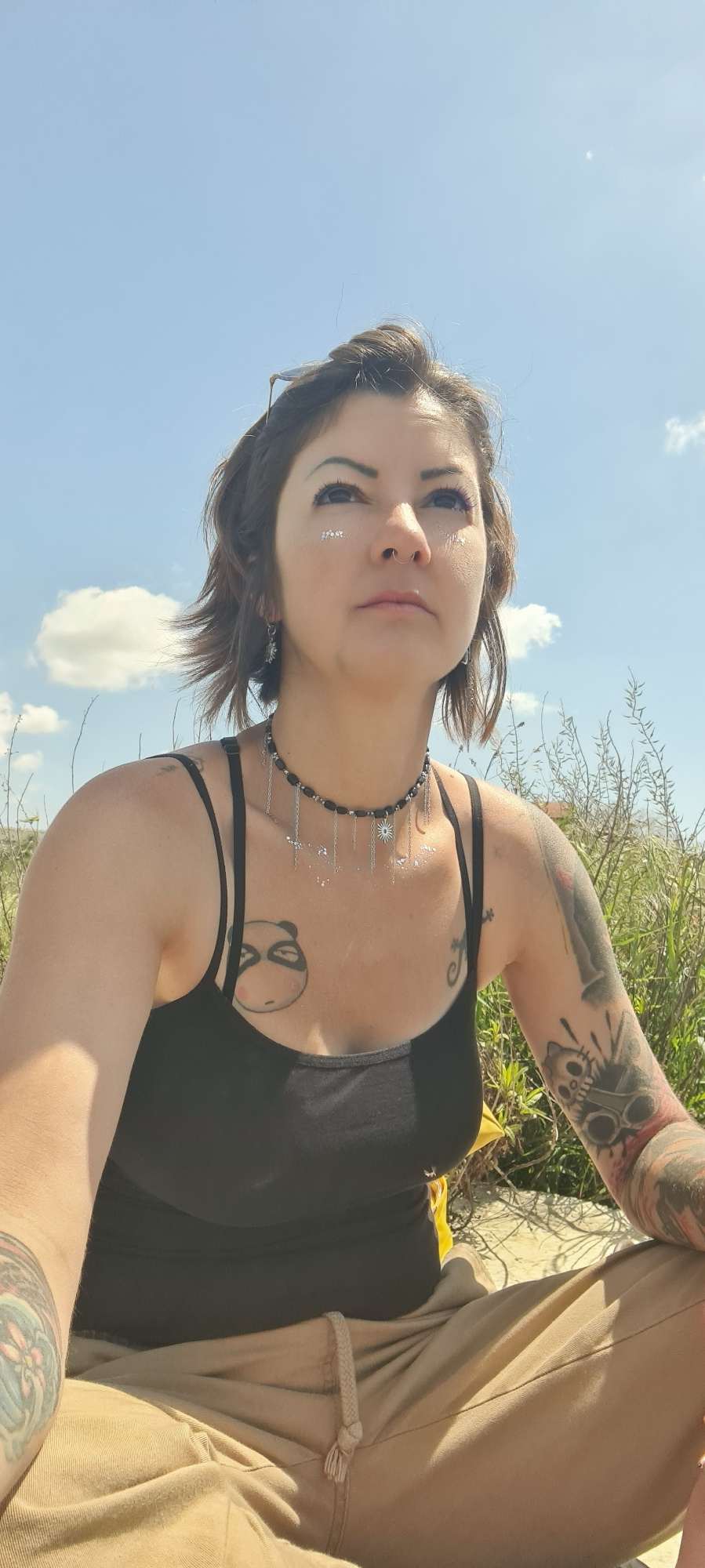 A woman with tattoos is posing outdoors in a sunny location. She is wearing a black tank top and khaki pants. She has short brown hair, a nose ring, and sparkles on her face and chest. A black and sil…read more