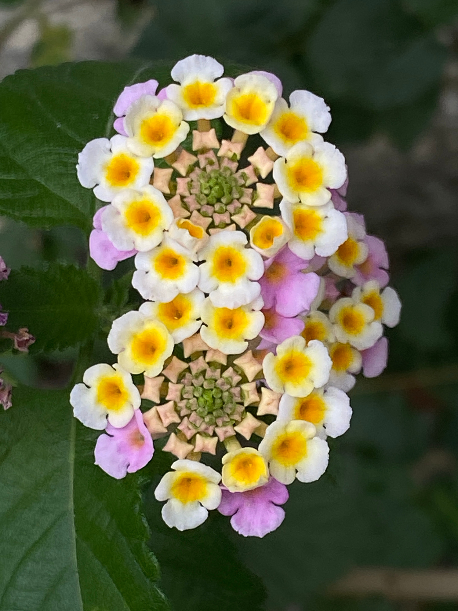 The image shows a close-up view of a cluster of Lantana flowers, with the location inferred as Tinaquillo, Venezuela. The flowers are arranged in a rounded inflorescence. The individual flowers are pr…read more