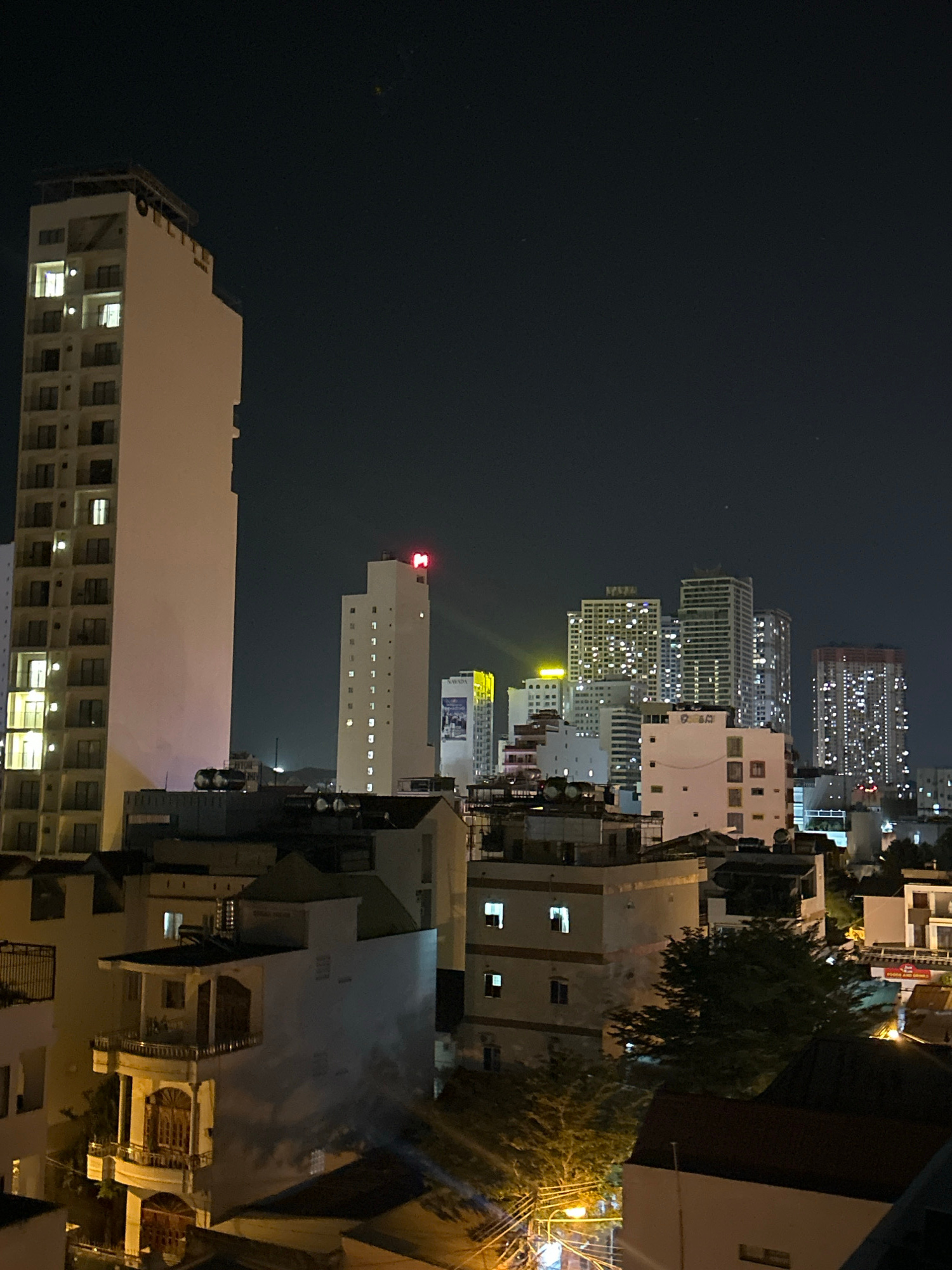 The image shows a nighttime cityscape of Bắc Nha Trang, Vietnam. Tall buildings and high-rise apartments are visible with lit windows. Some buildings have prominent red logos. The sky is dark. Street…read more