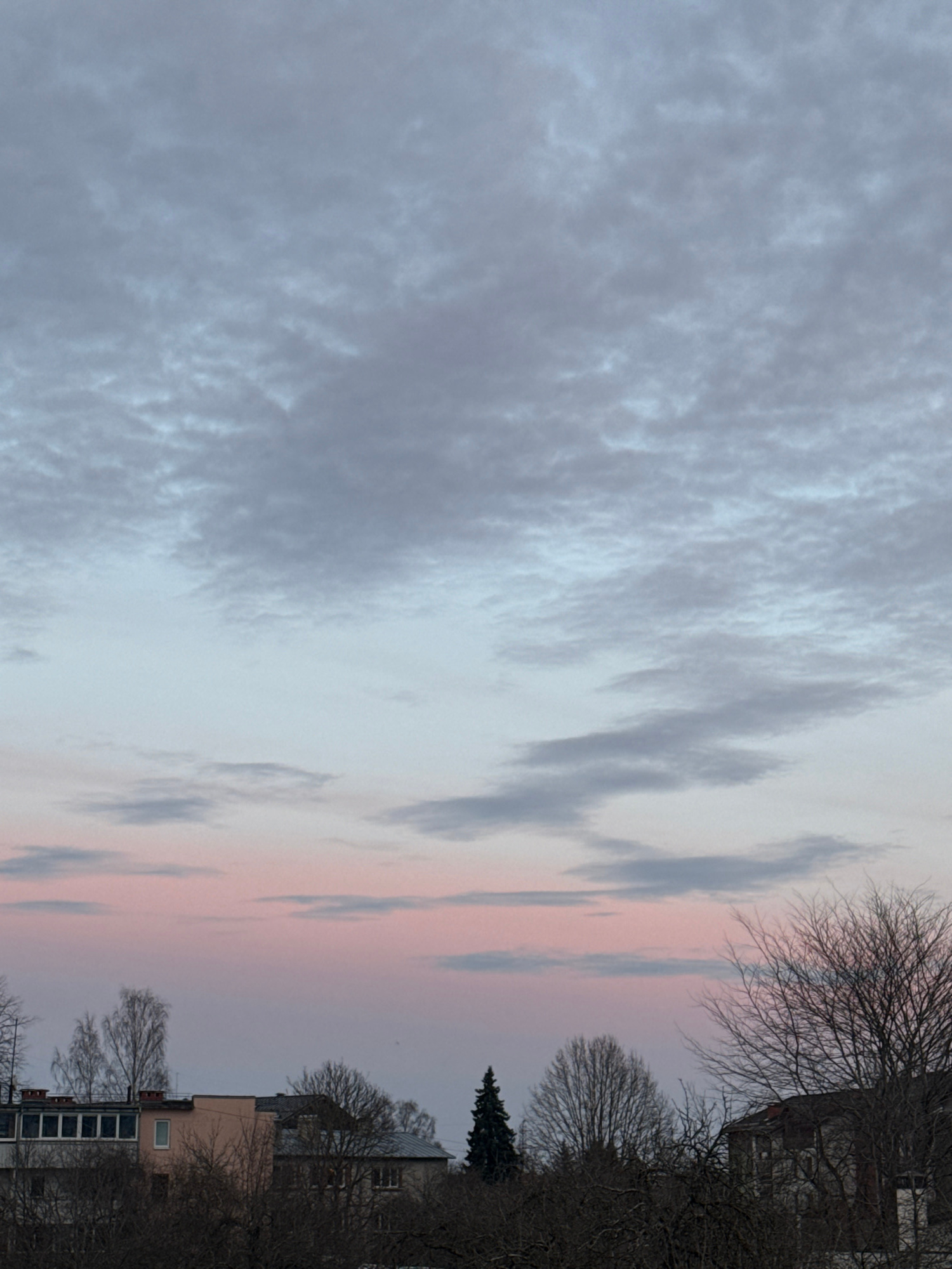 The image presents a view of the sky at what appears to be either dawn or dusk, with a mixture of gray, white, and pink hues in the clouds. A section of buildings and trees are visible along the right…read more
