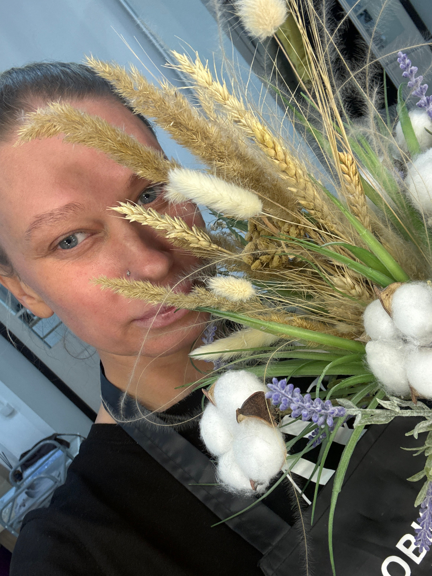 The image, rotated 90 degrees clockwise, captures a close-up of a person's face partially obscured by a dried floral bouquet, set indoors in Perm, Russia. The subject, likely female, has fair skin, li…read more
