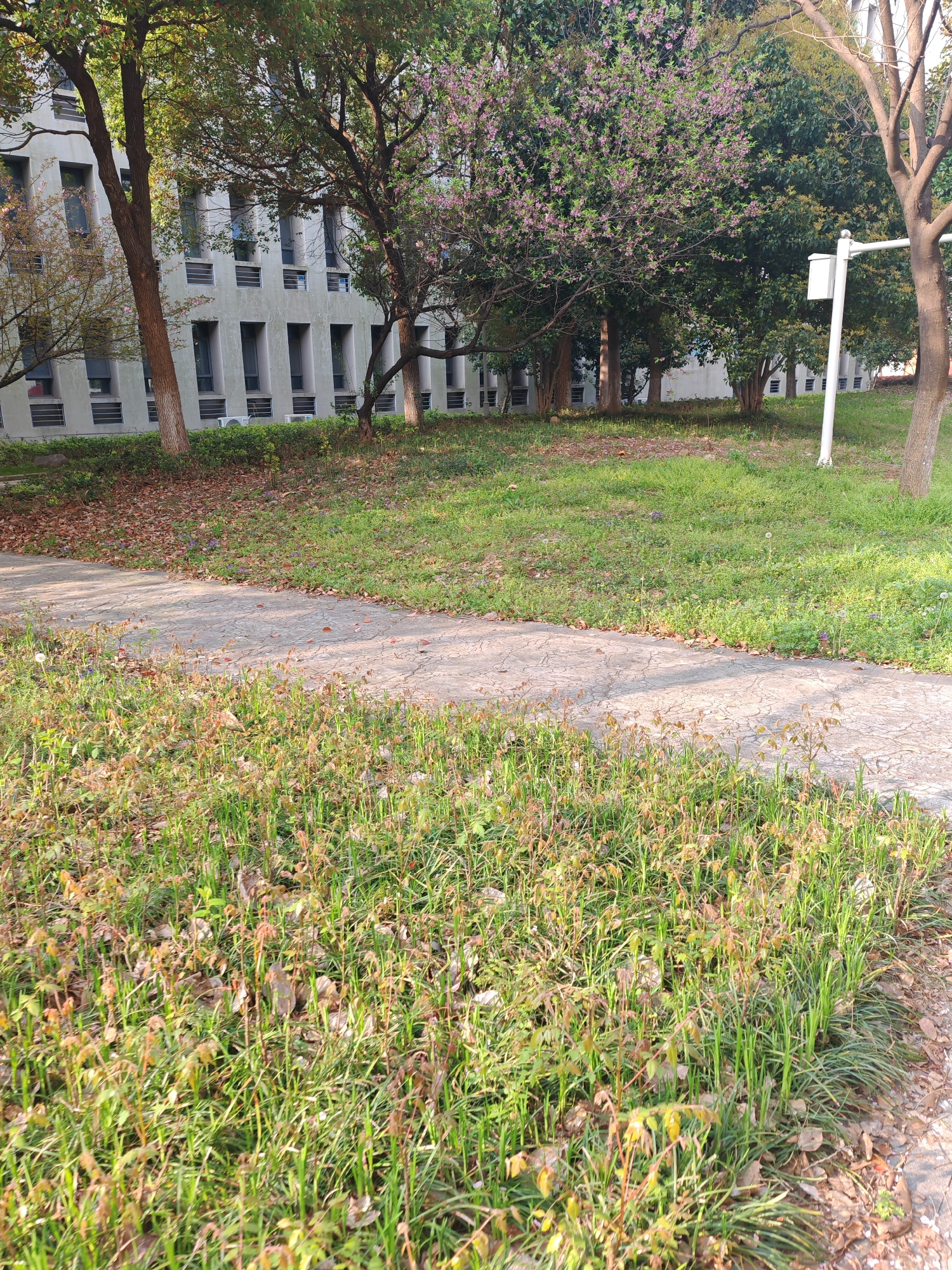 The image depicts a grassy area in the Jiangning District of China. A building with a series of rectangular windows is visible in the background, partially obscured by trees. Some trees are flowering…read more