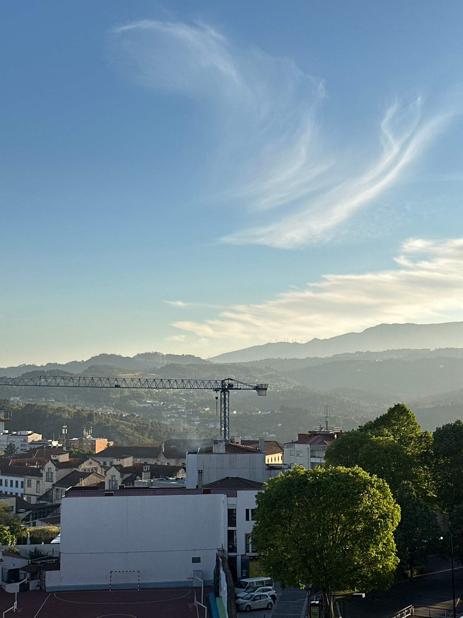 The image depicts a cityscape in Vila Real, Portugal, viewed from an elevated position. A blue sky with wispy clouds occupies the upper left portion. In the middle ground, layers of mountain ranges ap…read more