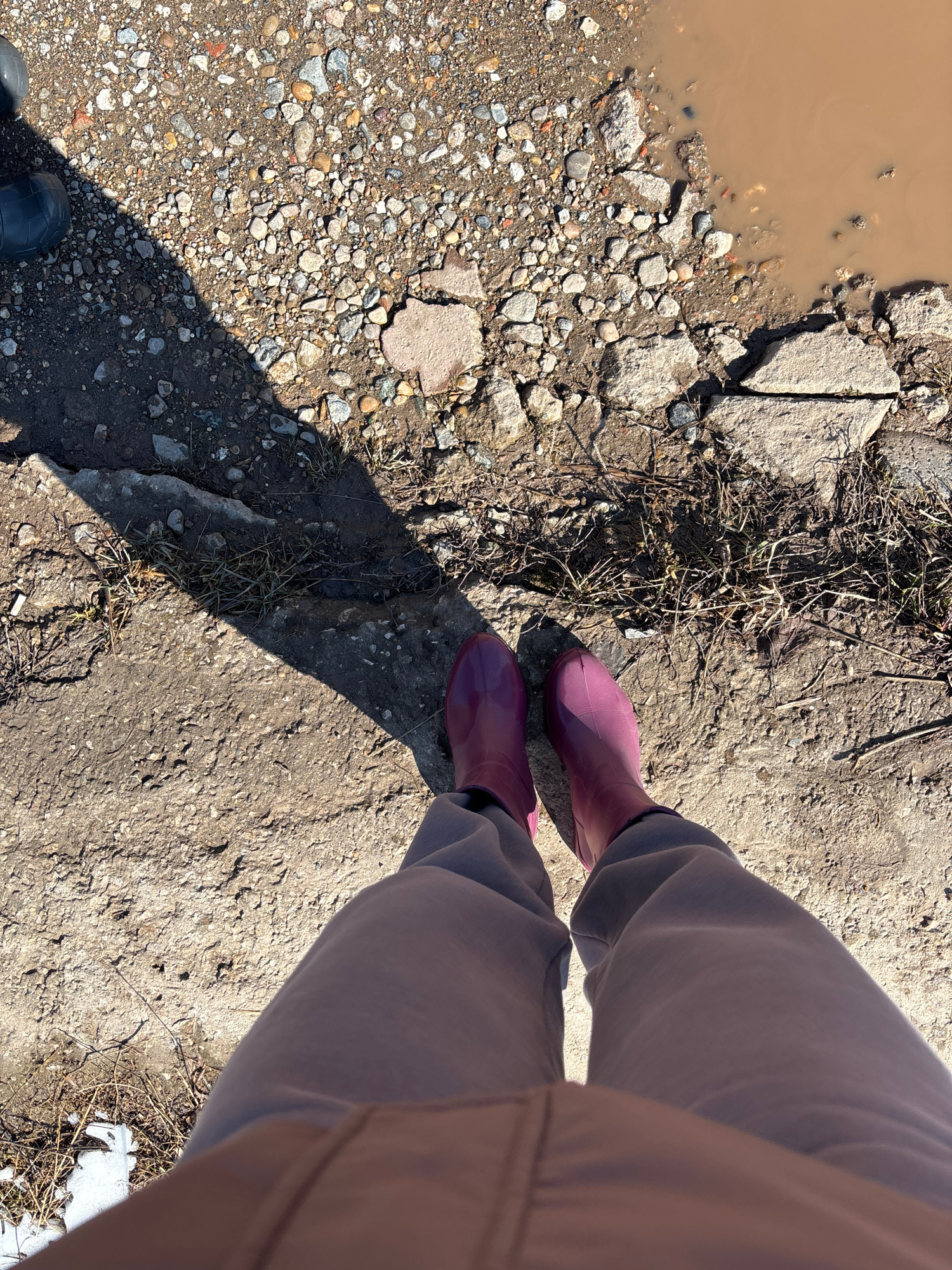 The image shows a person wearing pink rubber boots standing on cracked concrete. A muddy puddle is visible to the left, bordered by small rocks and larger chunks of concrete. Dry grass and weeds are s…read more
