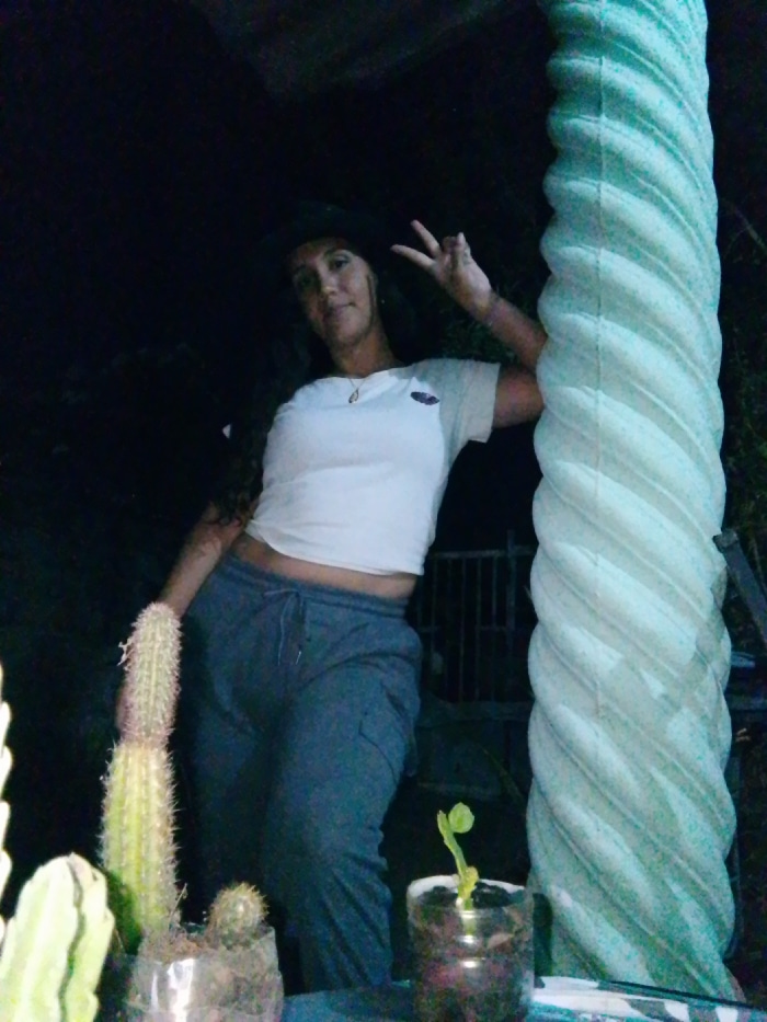 This image depicts a female individual posing in a dimly lit outdoor or semi-outdoor setting in Juan Griego, Venezuela. The subject, an adult with long, dark, wavy hair, is wearing a dark hat, a white…read more