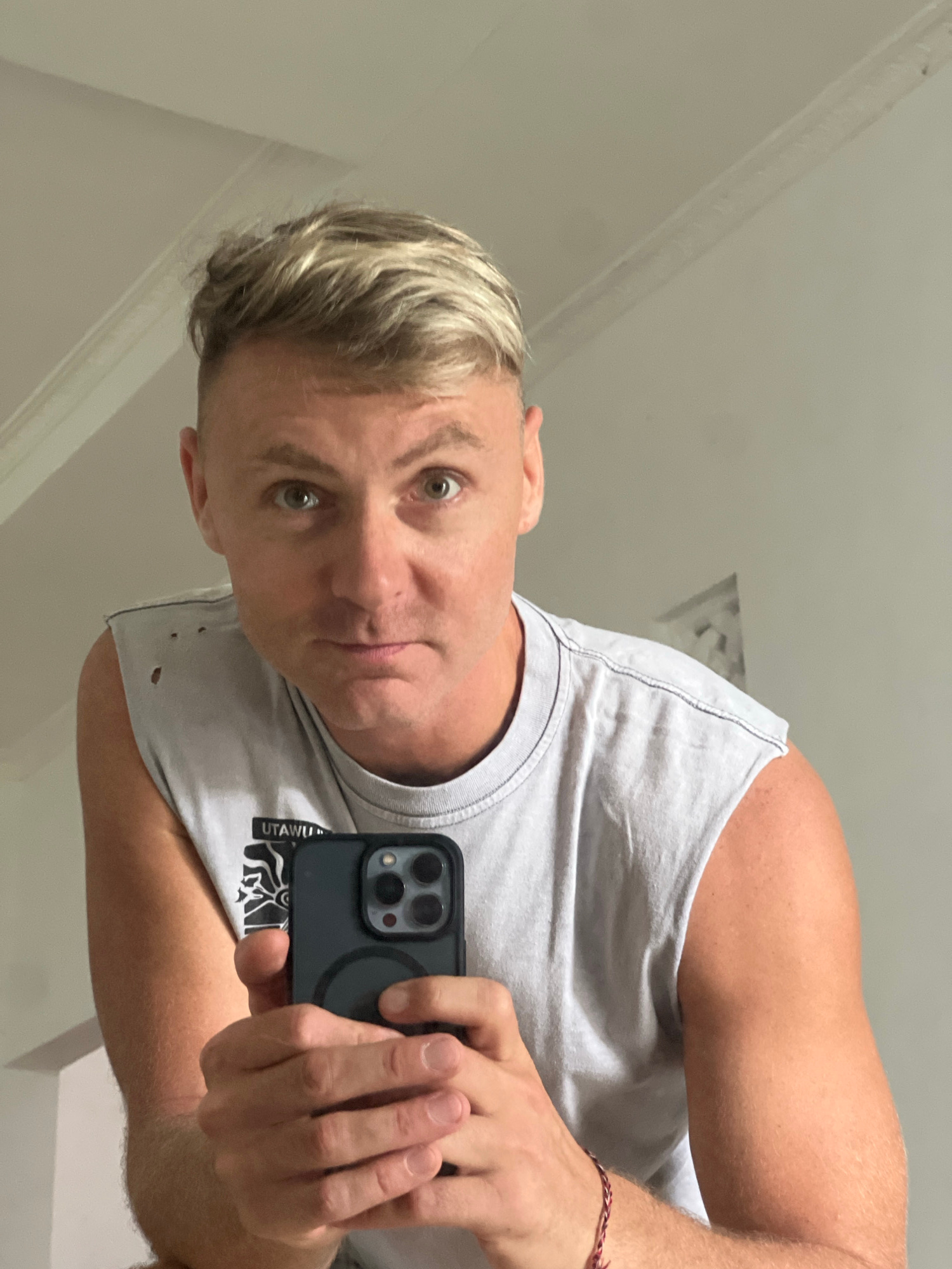A selfie captured in an indoor setting. The subject, a light-skinned male with blonde hair and light eyes, is holding a black smartphone with a triple-lens camera system. He wears a light gray tank to…read more