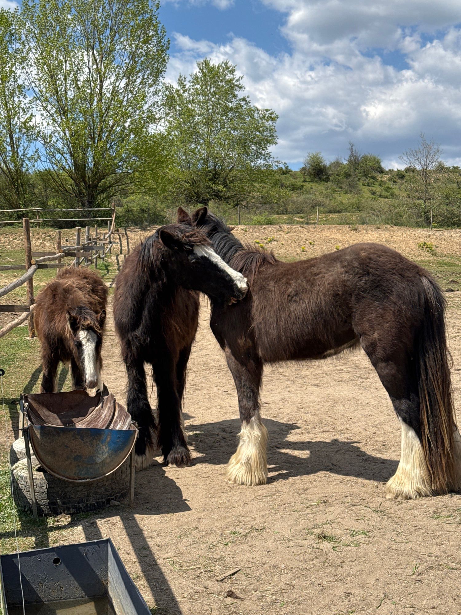 The image shows three horses standing on a dirt field. A large brown horse is standing at the top, with two younger horses below it. One of the younger horses is drinking from a metal trough. A wooden…read more