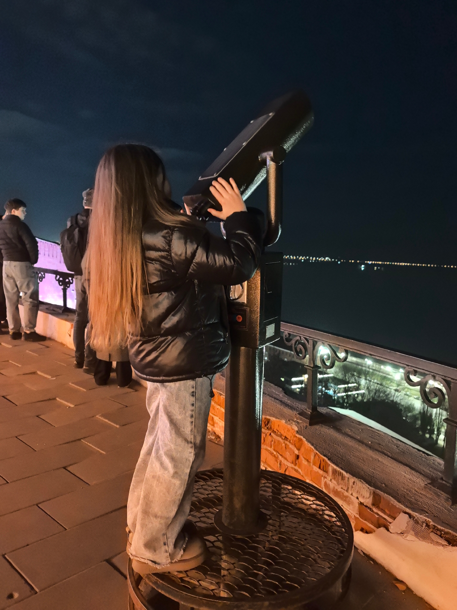The image shows a girl with long, straight brown hair looking through a coin-operated telescope at night. She is wearing a black puffer jacket and light-wash jeans. The telescope is situated on a meta…read more