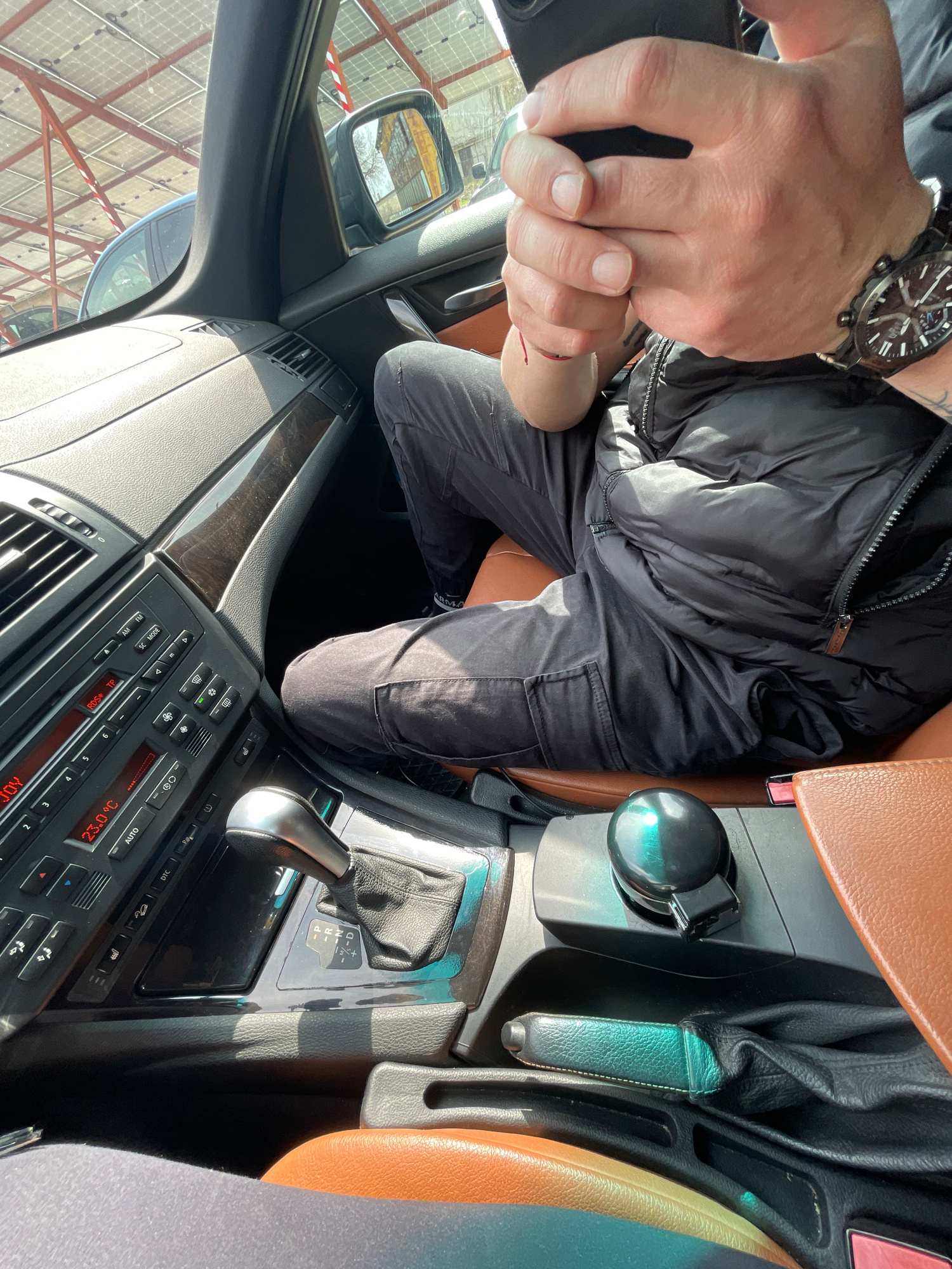 The image shows the interior of a car, specifically the driver's area. The driver's hand, wearing a watch, is gripping a fair-skinned person's hand. The person is seated, wearing dark clothing. The ca…read more