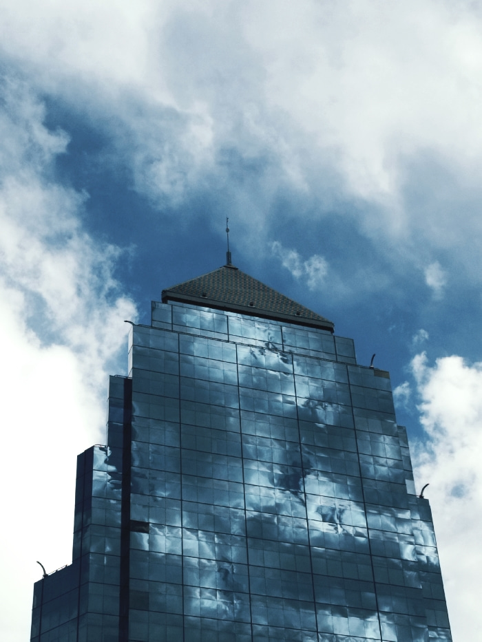 A modern glass skyscraper dominates the view, reflecting the sky in its facade. Blue-tinged clouds are visible both in the sky above and mirrored on the building. The building features a dark, sloping…read more