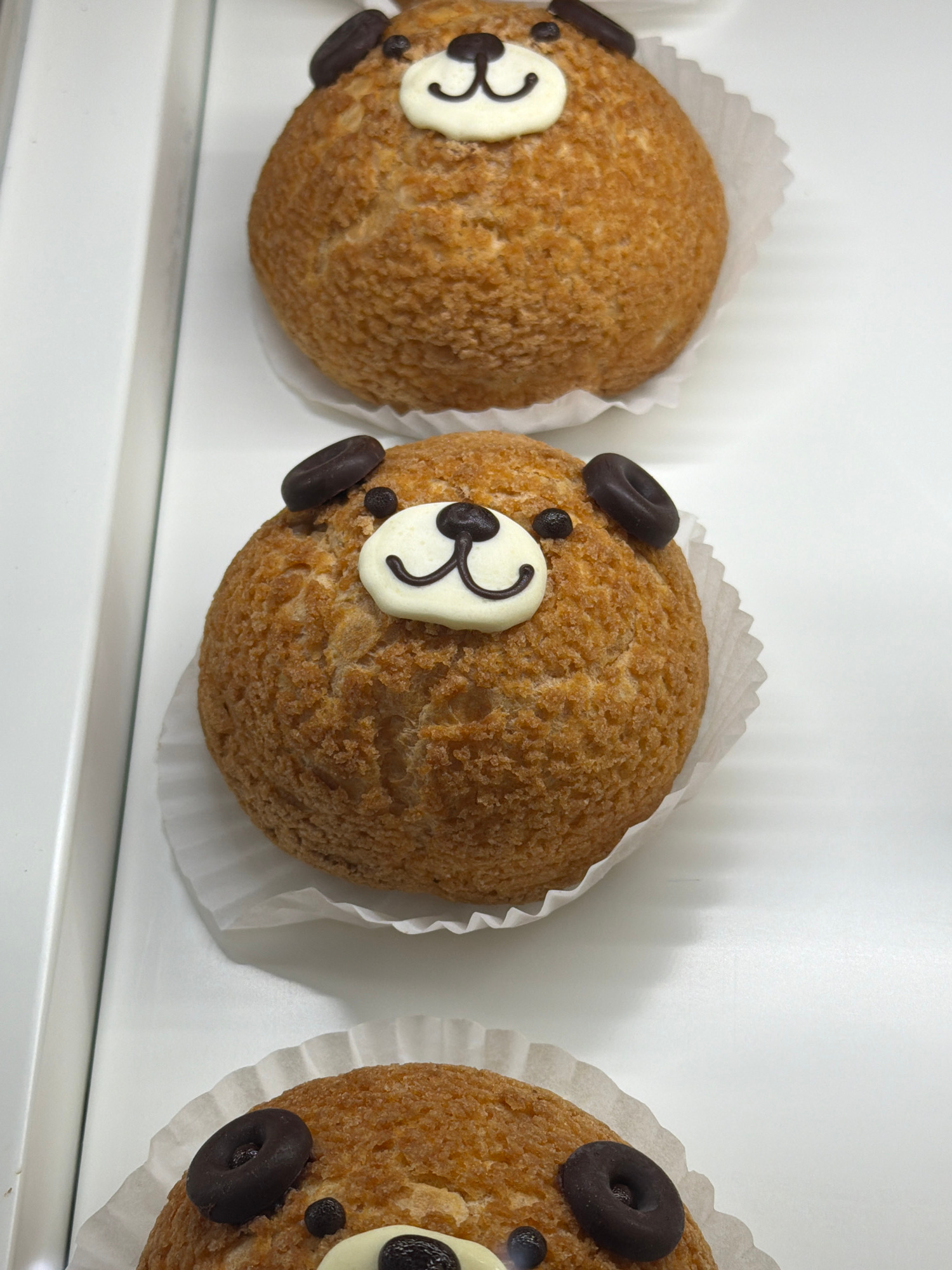 Three cream puffs in white paper liners are arranged in a row on a white surface. Each cream puff is decorated to resemble a bear's face, with dark chocolate pieces used for the ears and eyes, and a w…read more