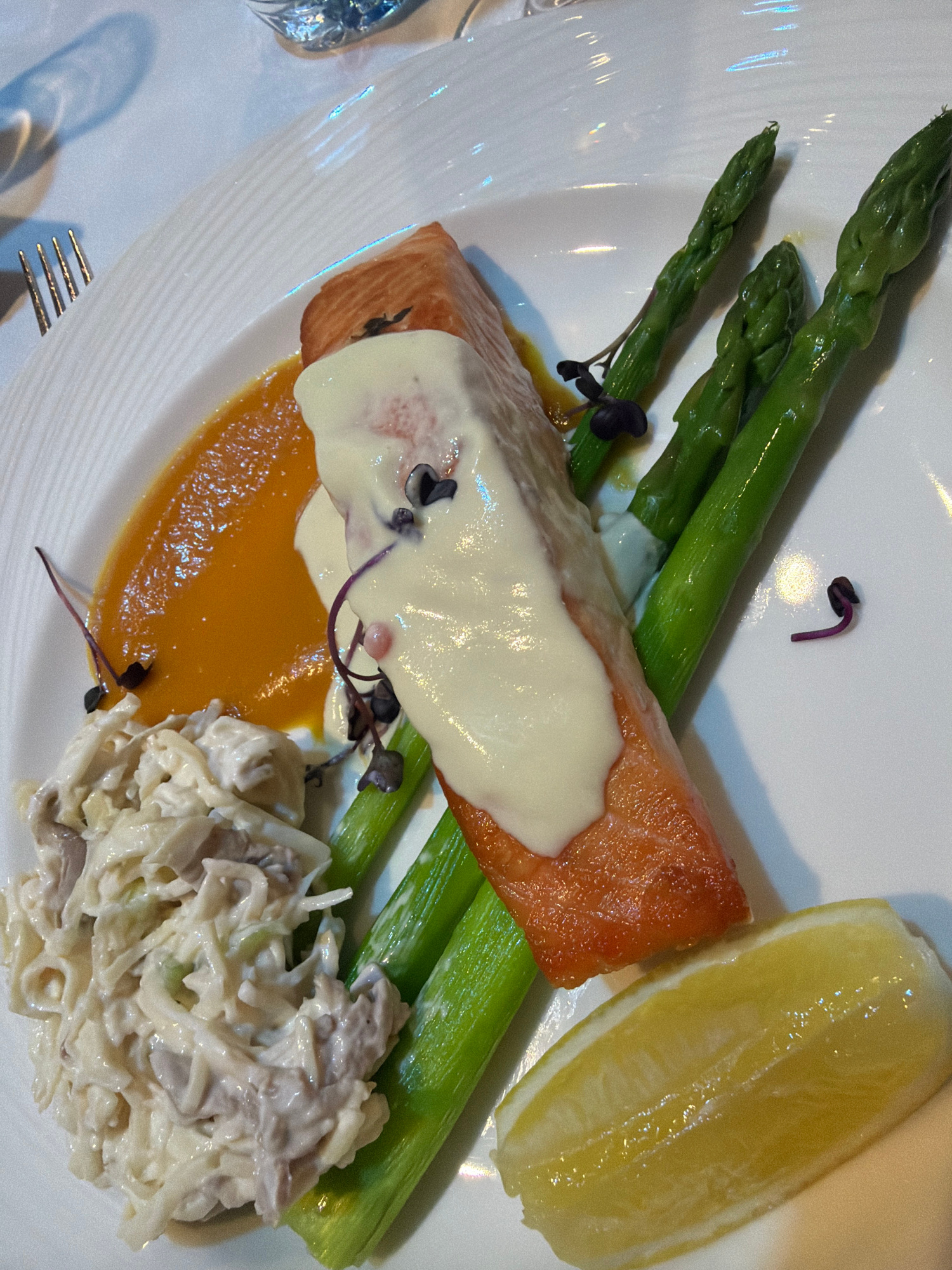 A top-down, close-up shot shows a plate of food. The main item appears to be a piece of salmon, topped with a white sauce. Beside the salmon are asparagus spears and a lemon wedge. There's also a crea…read more