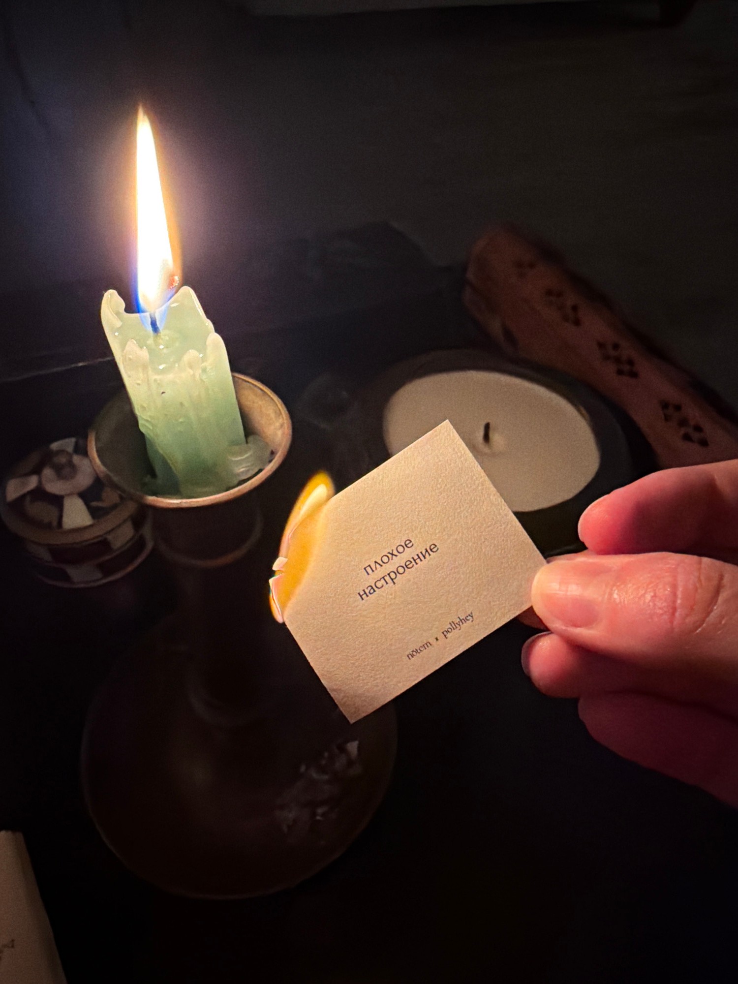 A hand holds a card with text in Russian, tilted over a lit candle with a light blue-green wax and a yellow flame. Molten wax drips onto the card. A second white candle sits unlit in the background. O…read more