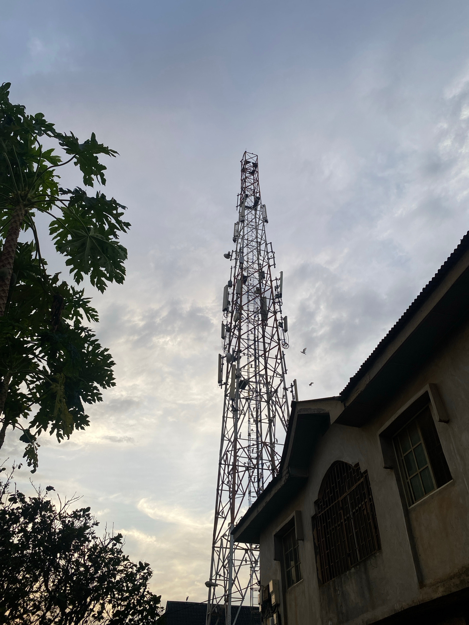 This upward-looking photograph captures a towering telecommunications lattice mast against an overcast sky, set in what appears to be an urban or semi-urban environment in Lagos, Nigeria. The metallic…read more