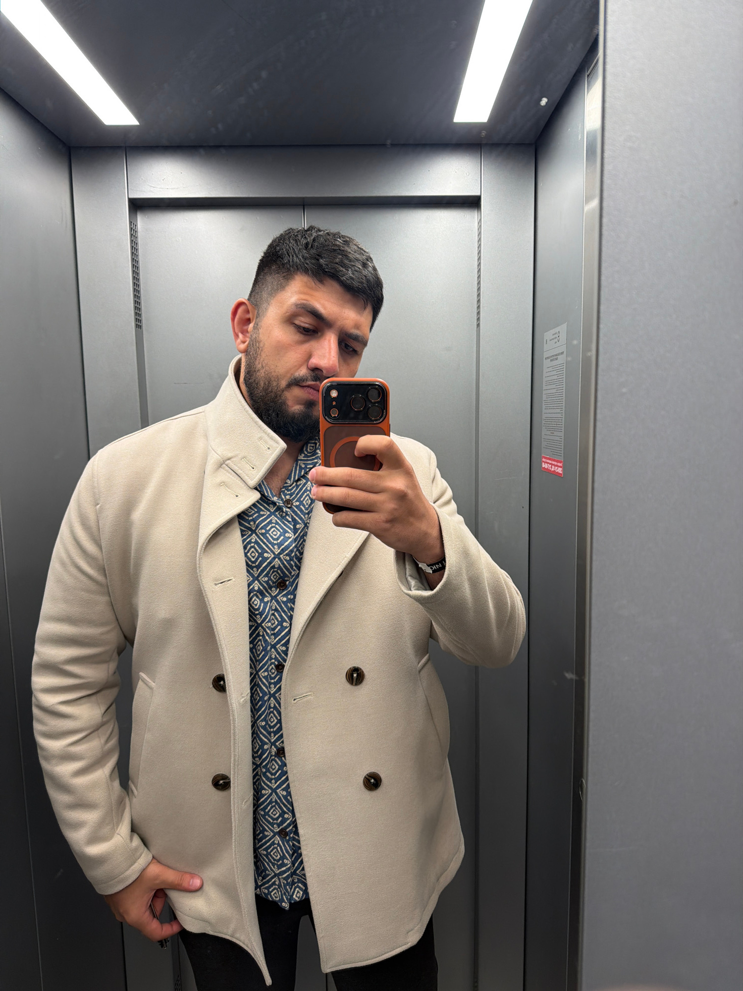 A man with dark hair and a beard is taking a selfie in an elevator. He is wearing a beige overcoat over a patterned blue shirt. The elevator has gray metal walls and fluorescent lighting on the ceilin…read more