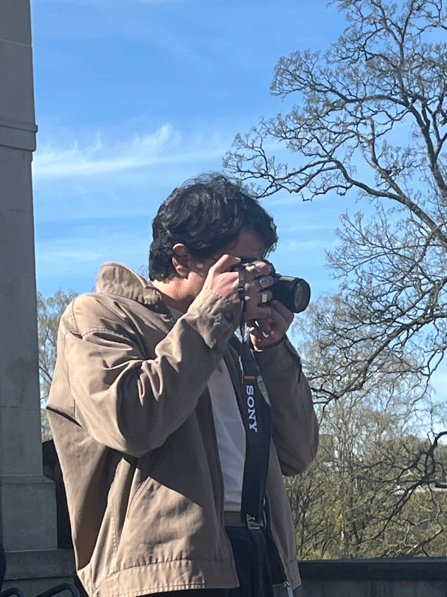 A person with dark curly hair wearing a khaki-colored jacket and a white shirt is holding a black Sony camera up to their face as if taking a photograph. The person has multiple rings on their fingersβ¦read more