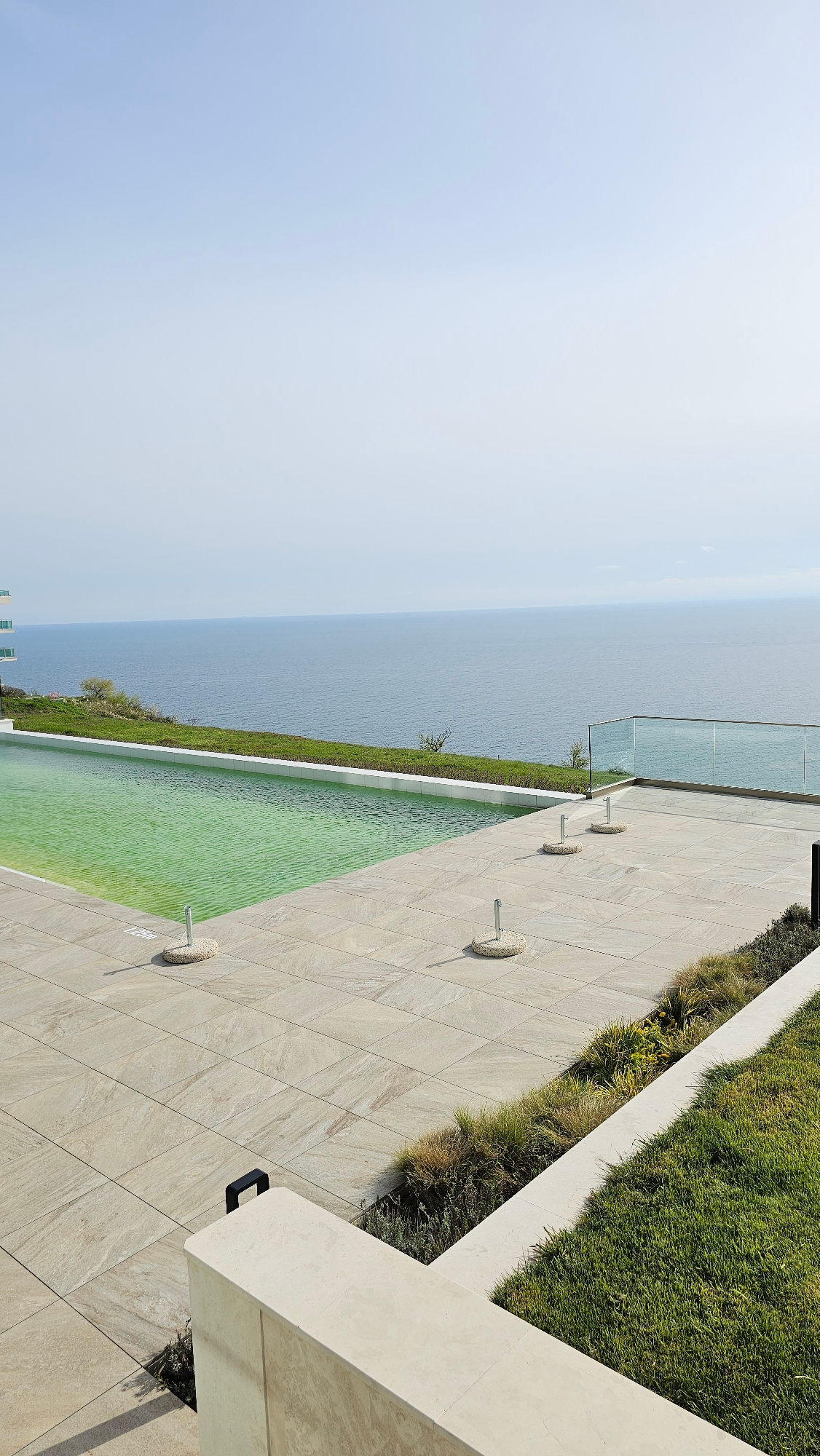 A rotated, high-angle shot shows the edge of an infinity pool extending towards the sea in Kavarna, Bulgaria. To the left, the pale sky meets the calm, blue sea on the horizon. The pool, filled with g…read more