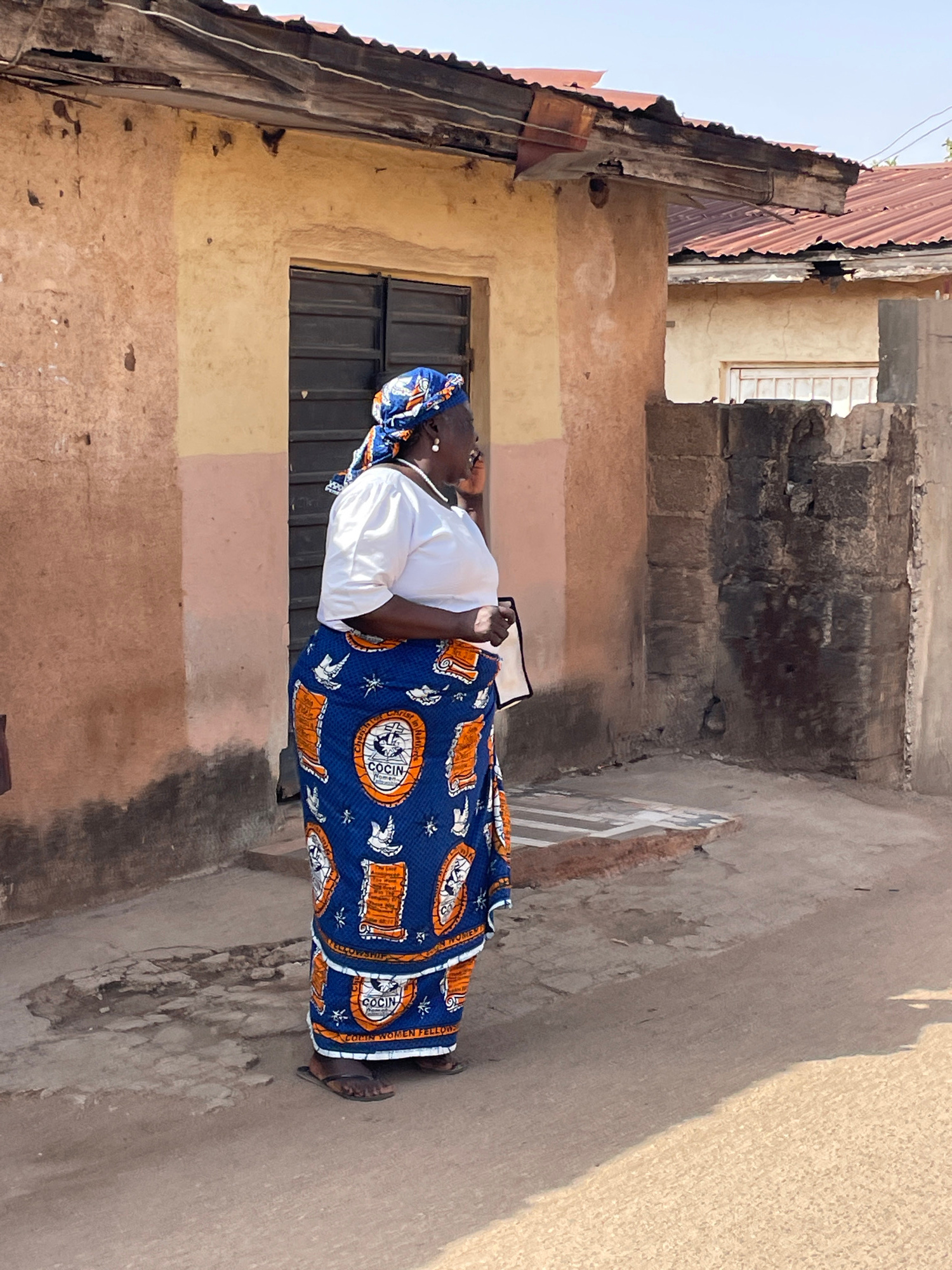 An outdoor, full-body shot captures an elderly woman standing on a narrow, unpaved path between two buildings under bright daylight. The image is oriented vertically, with the woman on the left side,…read more