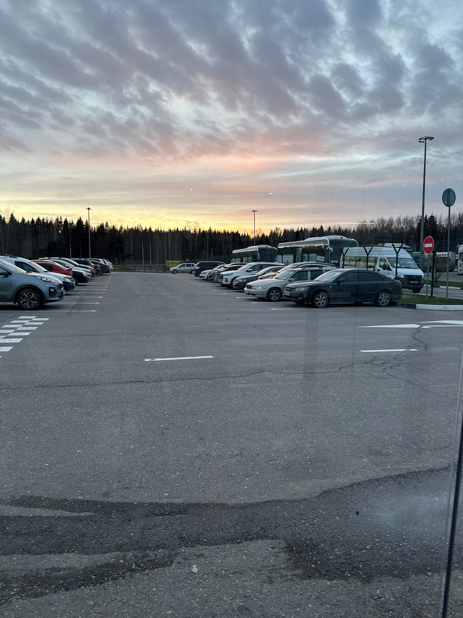 The image shows a parking lot in Lupanovo, Russia, at dusk or dawn, characterized by rows of parked cars alongside a road. A line of trees separates the parking area from a background of buildings andβ¦read more