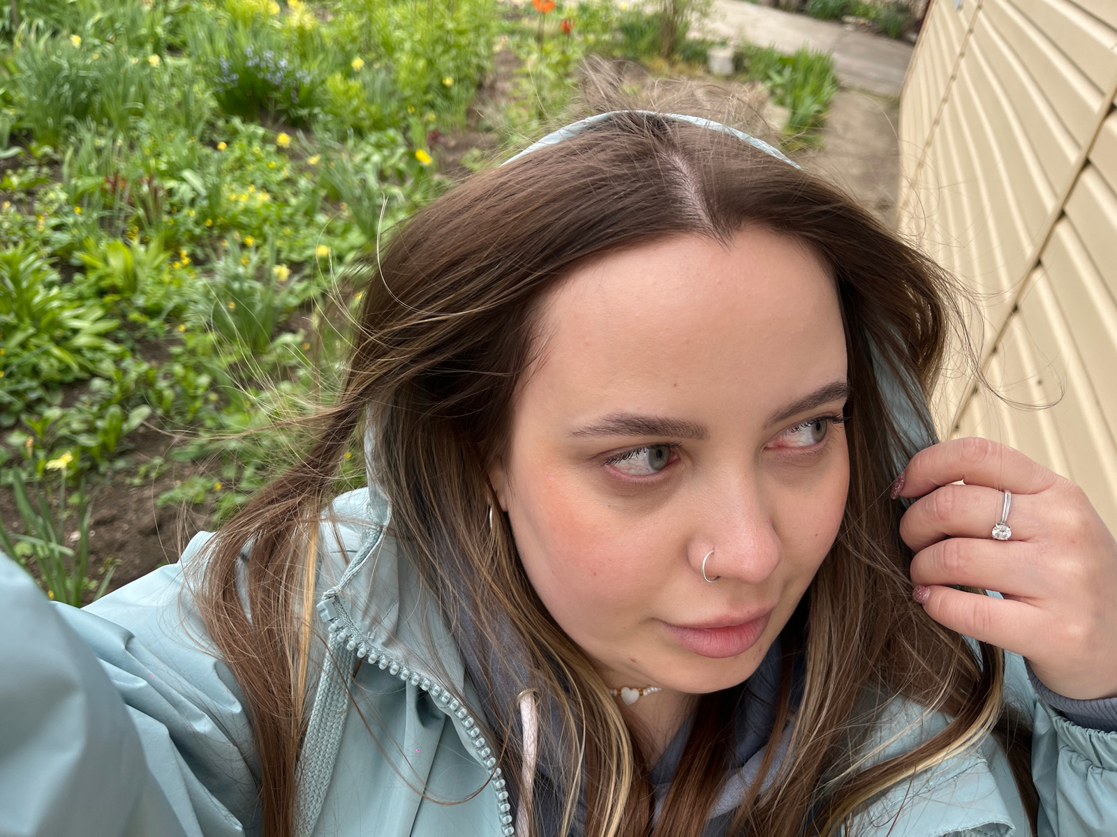 A young woman with brown hair, fair skin, and a nose ring is holding her hand up showing a ring on her finger, while posing for a selfie. She is wearing a light blue jacket and a necklace. Behind her,…read more