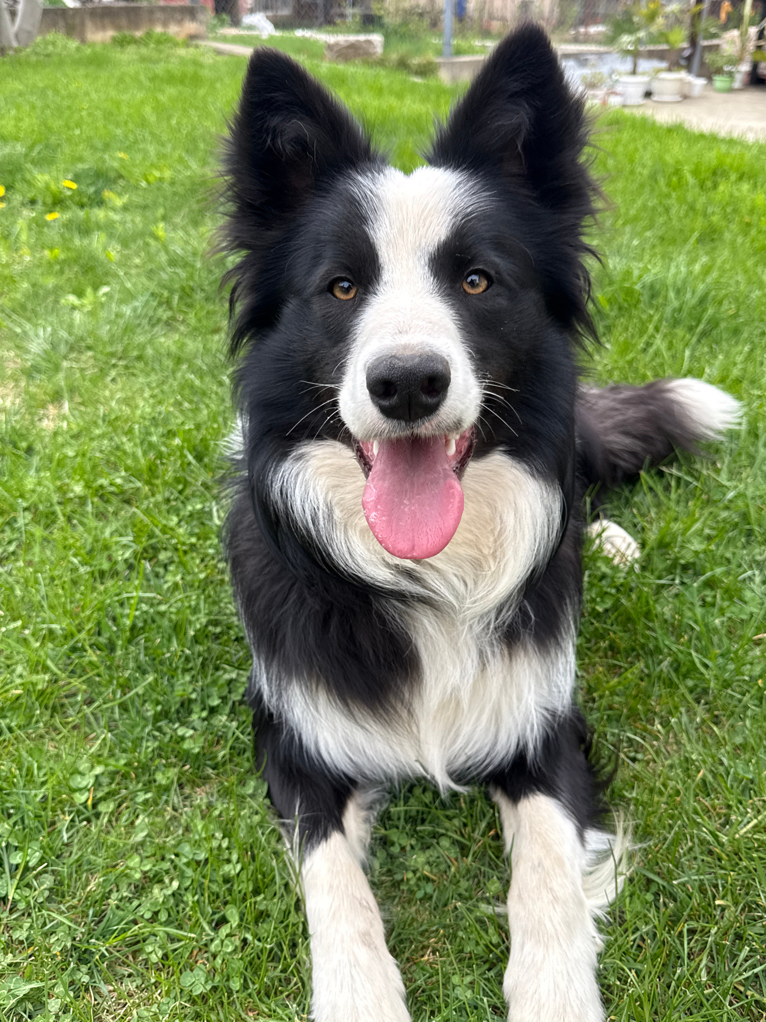 A black and white Border Collie lies on its back on a patch of green grass with some yellow dandelions. The dog's tongue is lolling out. A white ball is visible in the grass behind the dog. The locati…read more