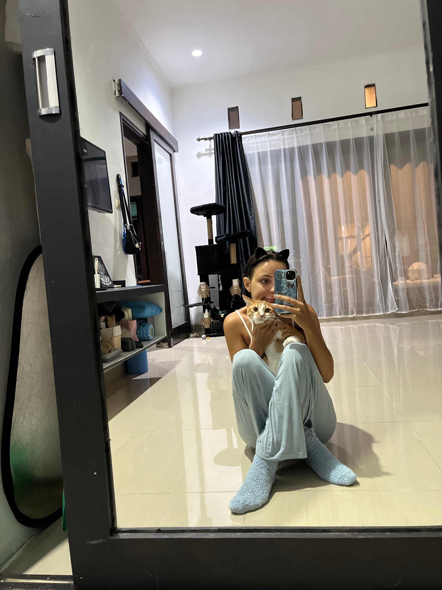 A woman wearing cat-ear headwear and blue pajama pants and socks is sitting on a tan-tiled floor, holding a cat and taking a selfie with a cell phone. The reflection shows a room with white walls, a sā¦read more