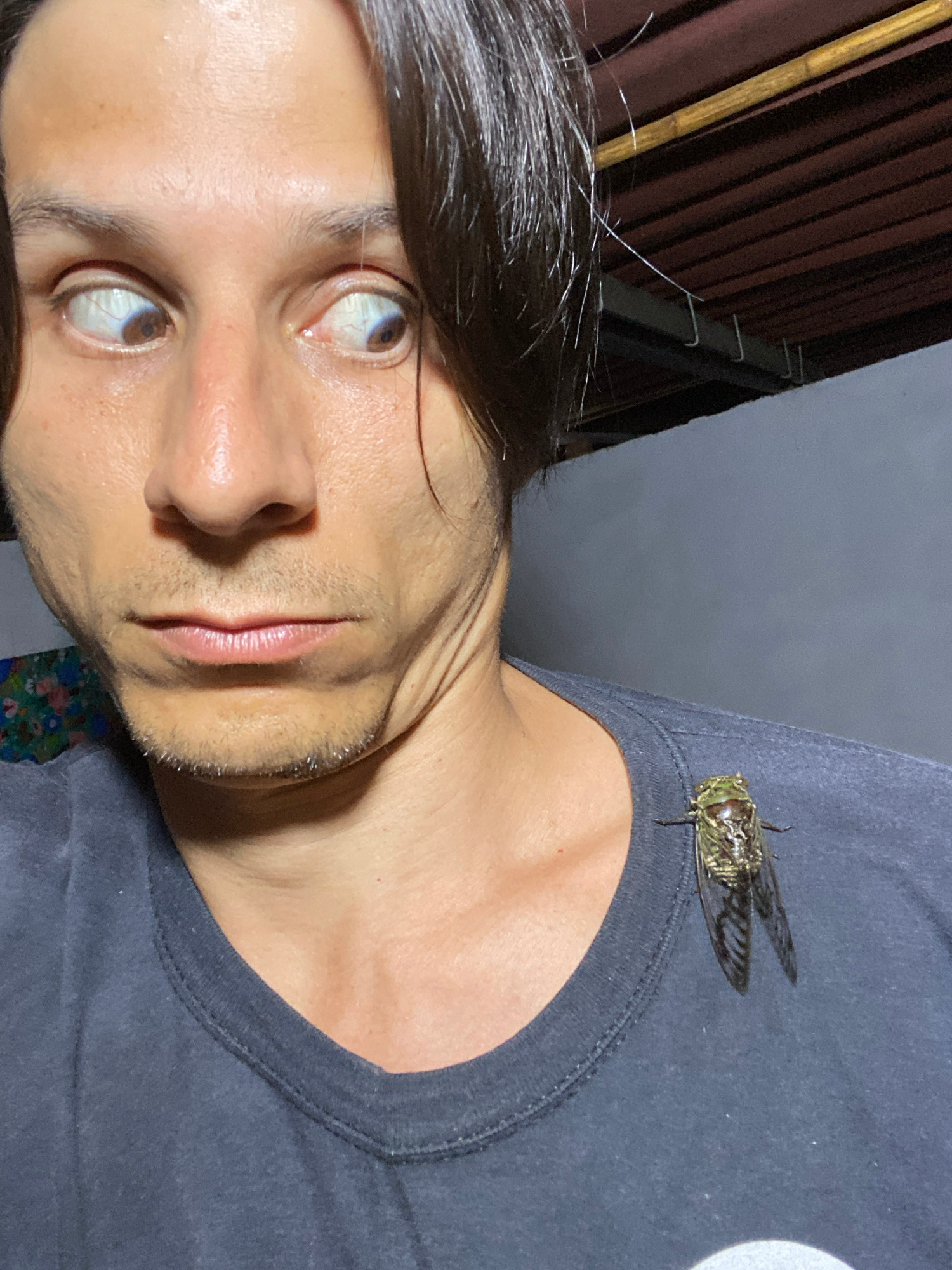 A man is pictured in a close-up selfie. He is wearing a gray t-shirt, upon which a cicada is perched on his upper right shoulder area. He has dark hair, light brown eyes, and a light complexion. The b…read more