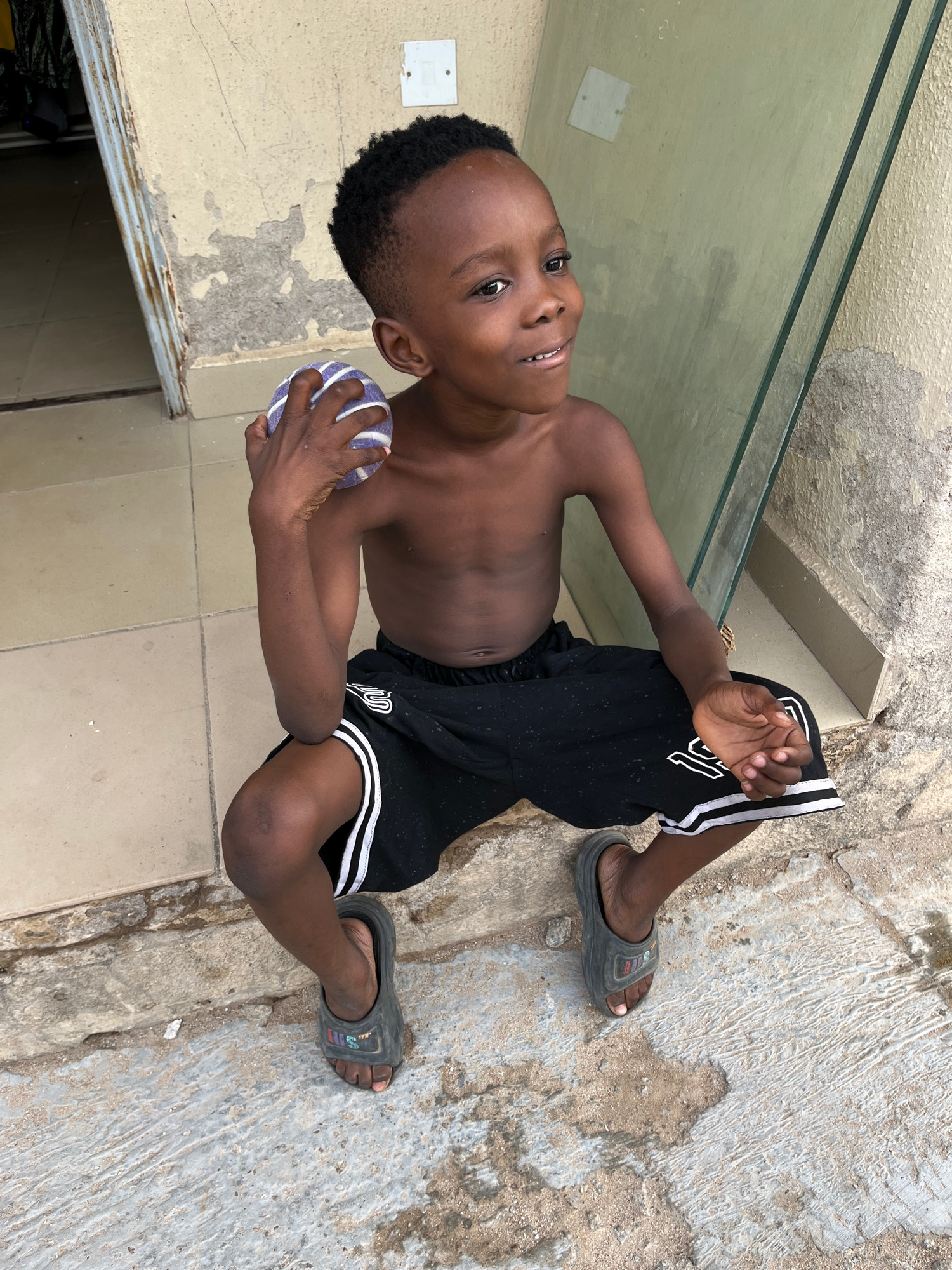 A young boy, appearing to be around 7 years old, is lying down on a tiled floor next to a rough, concrete surface in what seems to be an outdoor space. The boy is shirtless and wearing black shorts wi…read more