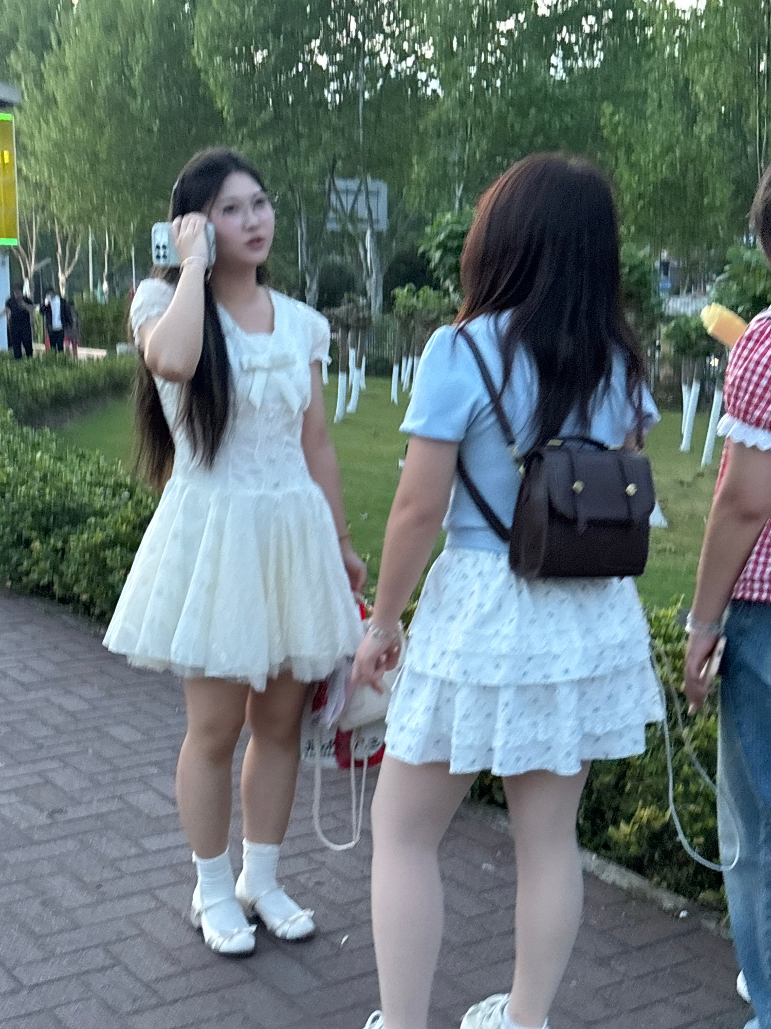 The image shows three young women walking on a paved path in a park-like setting. One woman wears a white dress and white socks with white shoes, and is holding a phone. Another wears a light blue top…read more