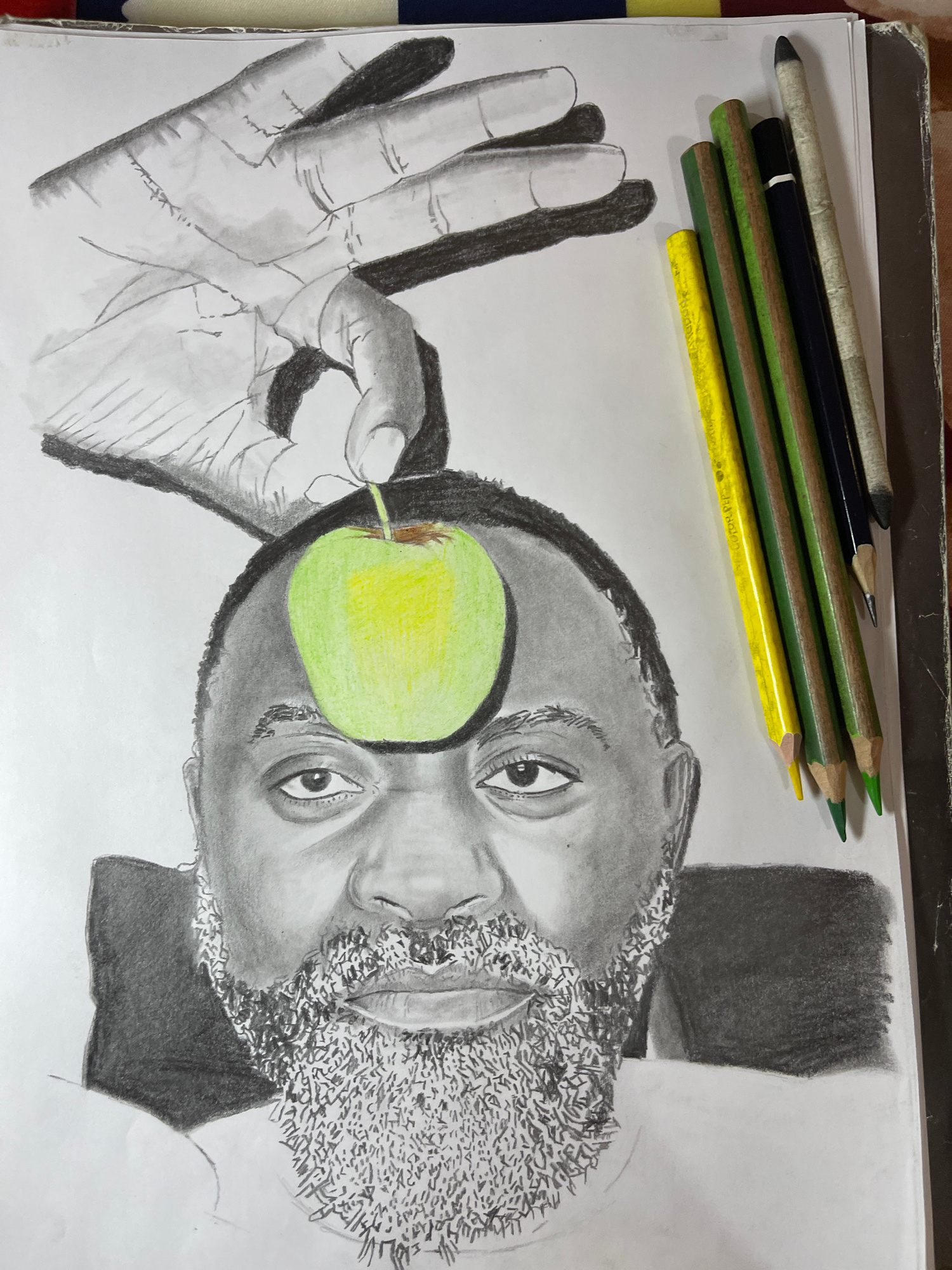 A drawing on white paper shows a portrait of a person with a full beard, obscuring one eye with a green apple held in their hand, framed by an "OK" gesture. The drawing is rendered in shades of gray,…read more