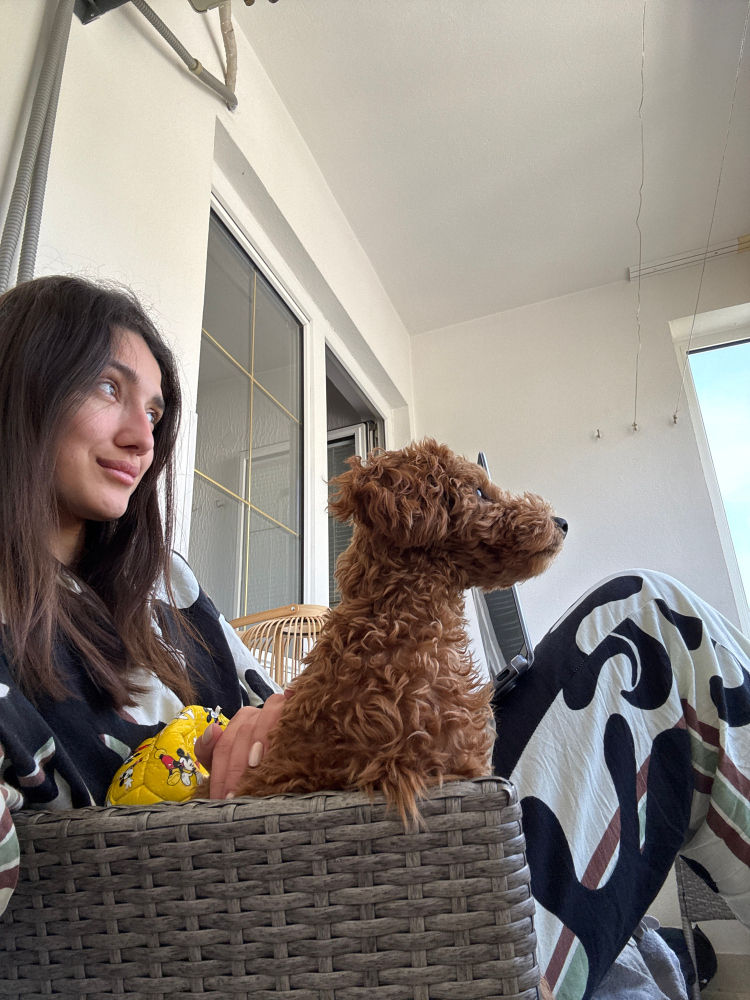 This image captures a serene indoor moment between a young woman and her dog, set in a brightly lit room. The scene is viewed from a low angle, looking upwards towards a skylight. In the lower left,…read more