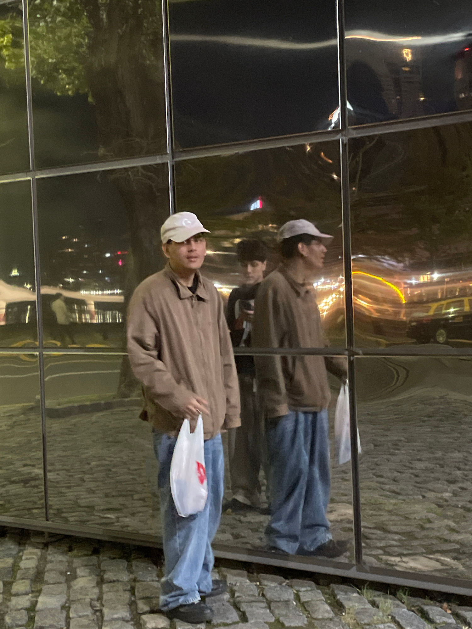 A man is reflected in a metallic wall. He is wearing a white cap, a tan jacket, and blue jeans. He is holding a white plastic bag. The reflection also includes street lights and trees. The wall is div…read more