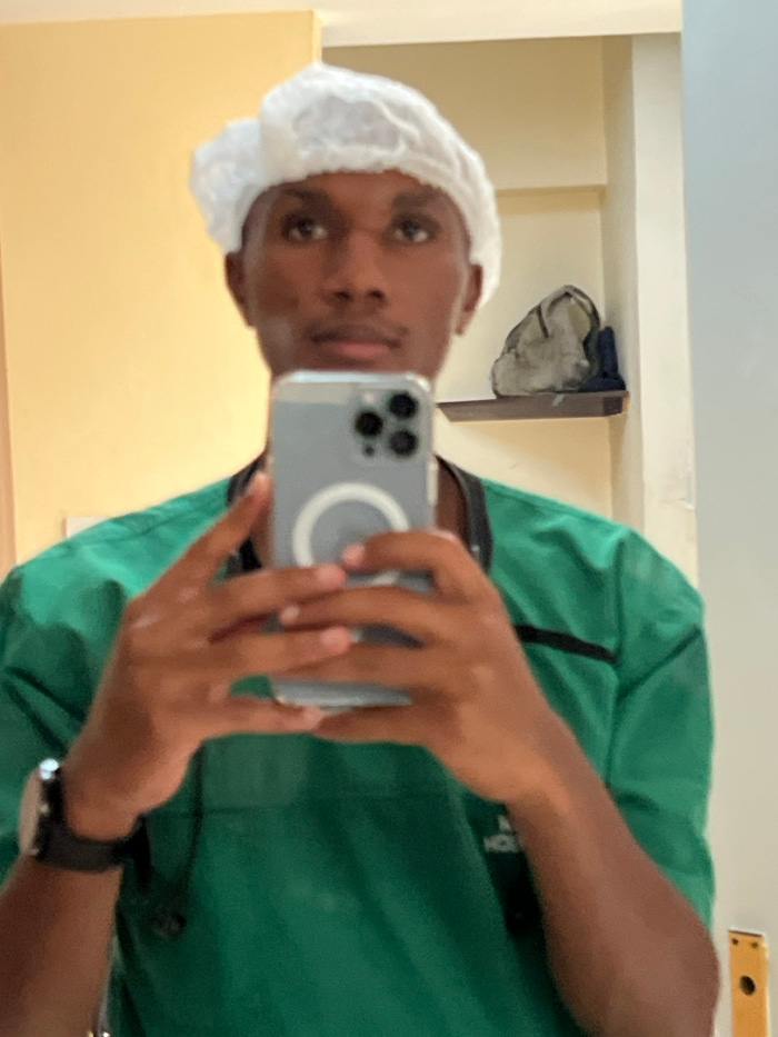 A dark-skinned adult male is depicted taking a mirror selfie in an indoor setting, likely a medical facility in Nairobi, Kenya. He wears a white disposable hair net, a dark green scrub top with a blac…read more