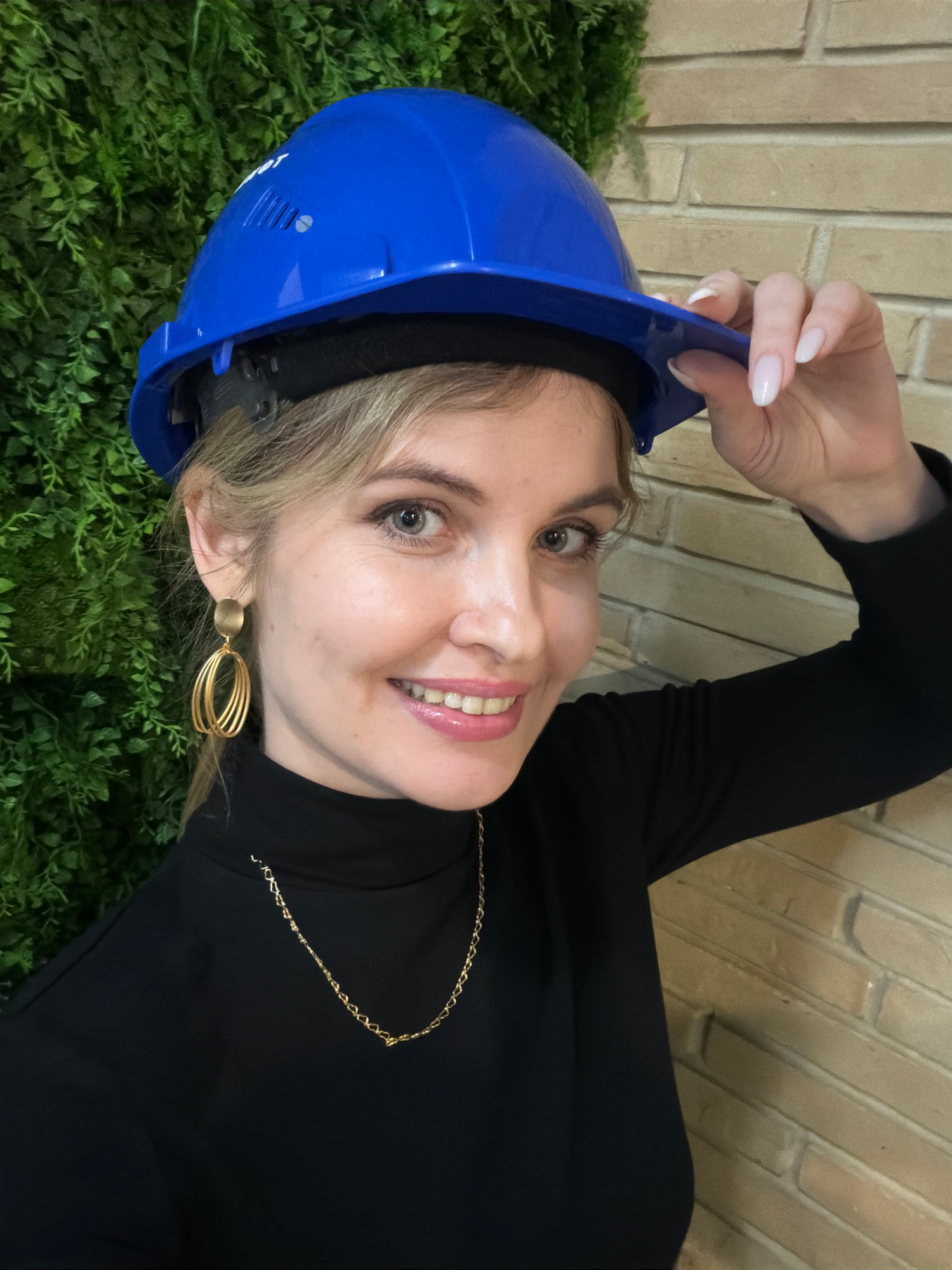 A woman is holding a blue hard hat while smiling at the camera. She is wearing a black top with a gold necklace and earrings. The background consists of a brick wall and some green foliage. The locati…read more