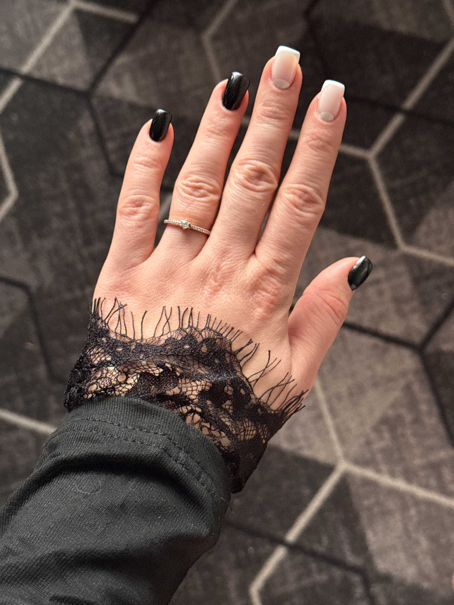 A woman's hand is presented against a backdrop of geometric patterns. Her nails are manicured with a combination of black and white french tips. A diamond ring adorns her ring finger. A black lace sle…read more