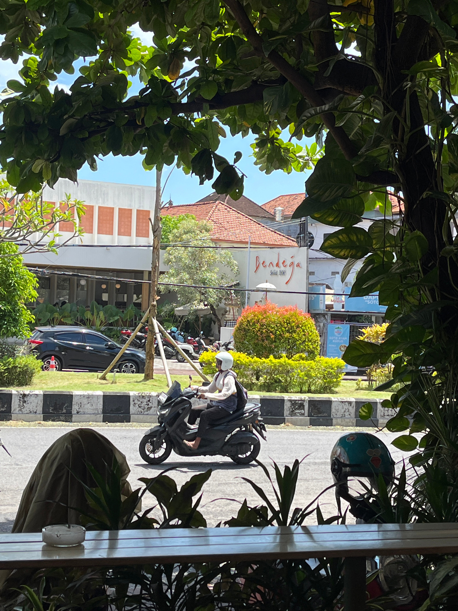 The image shows a street view in Kuta Selatan, Indonesia. A person on a black motorbike with a white helmet is stopped along a curb with black and white markings. The background features buildings, in…read more