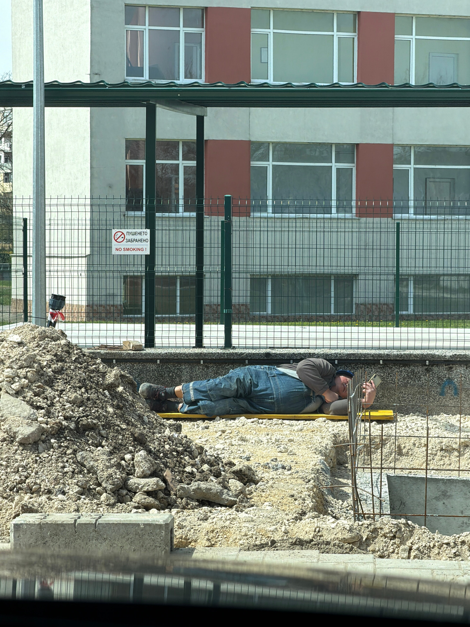 A man wearing overalls and a cap is working on a construction site. He is standing next to a pit and holding a mobile phone in his right hand. In the pit there is rebar and yellow boards. The ground a…read more