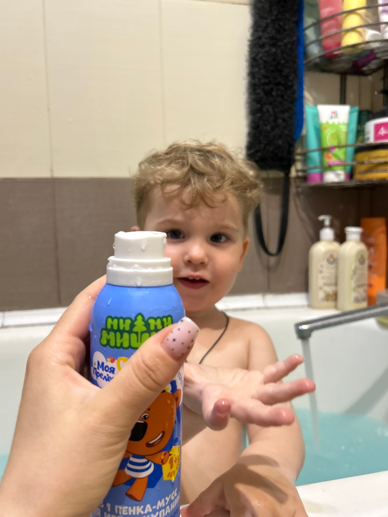 This image captures a domestic scene in a bathroom in Klin, Russia, focusing on a child's bath time. A young child, likely a toddler, with curly blonde hair, is partially visible in a white bathtub, l…read more
