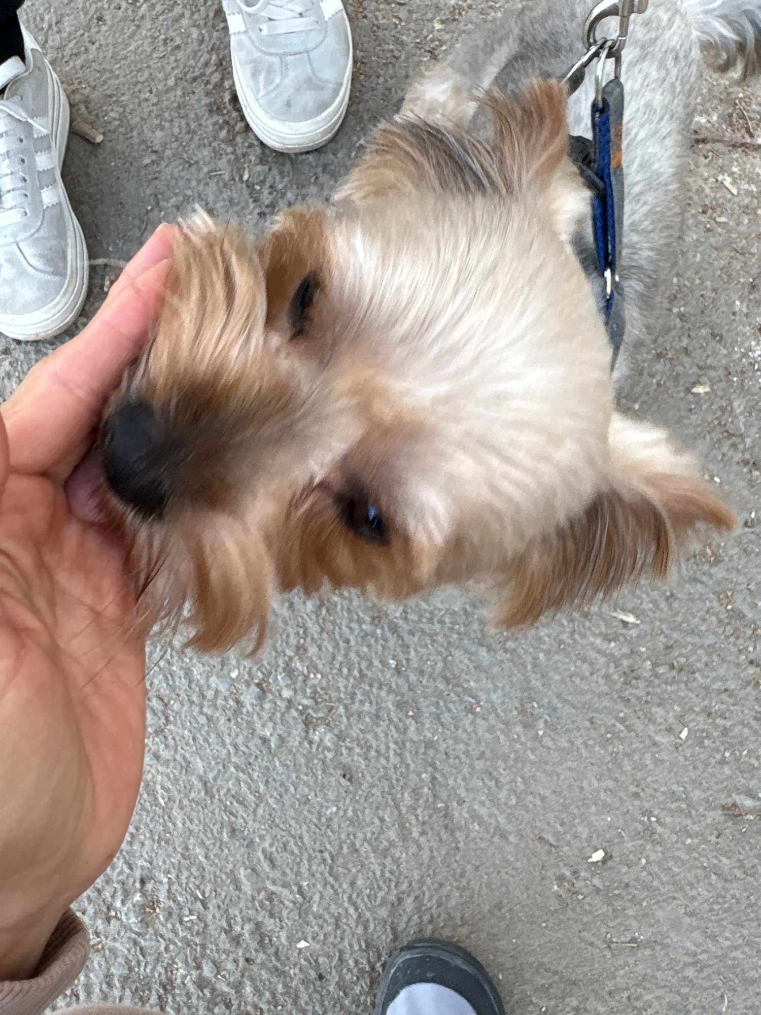 A close-up view shows a tan and brown Yorkshire Terrier-type dog with its face near a human hand. The dog is wearing a blue harness and leash. Portions of two pairs of athletic shoes are visible in th…read more