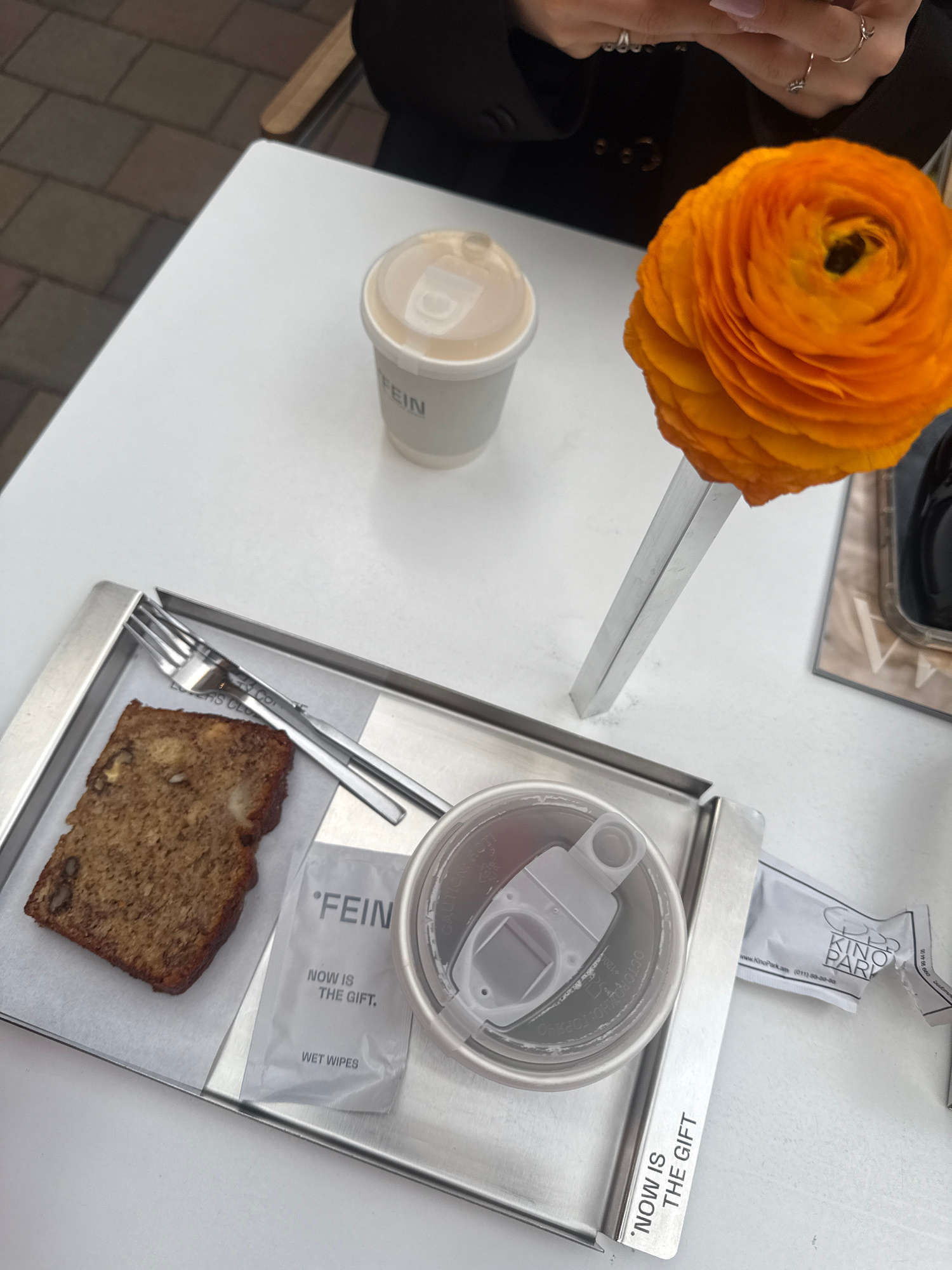 The image depicts a table setting in what appears to be an outdoor café, likely in Yerevan, Armenia, given the presence of "KinoPark.am" printed on a package. On the white tabletop, there is a single…read more