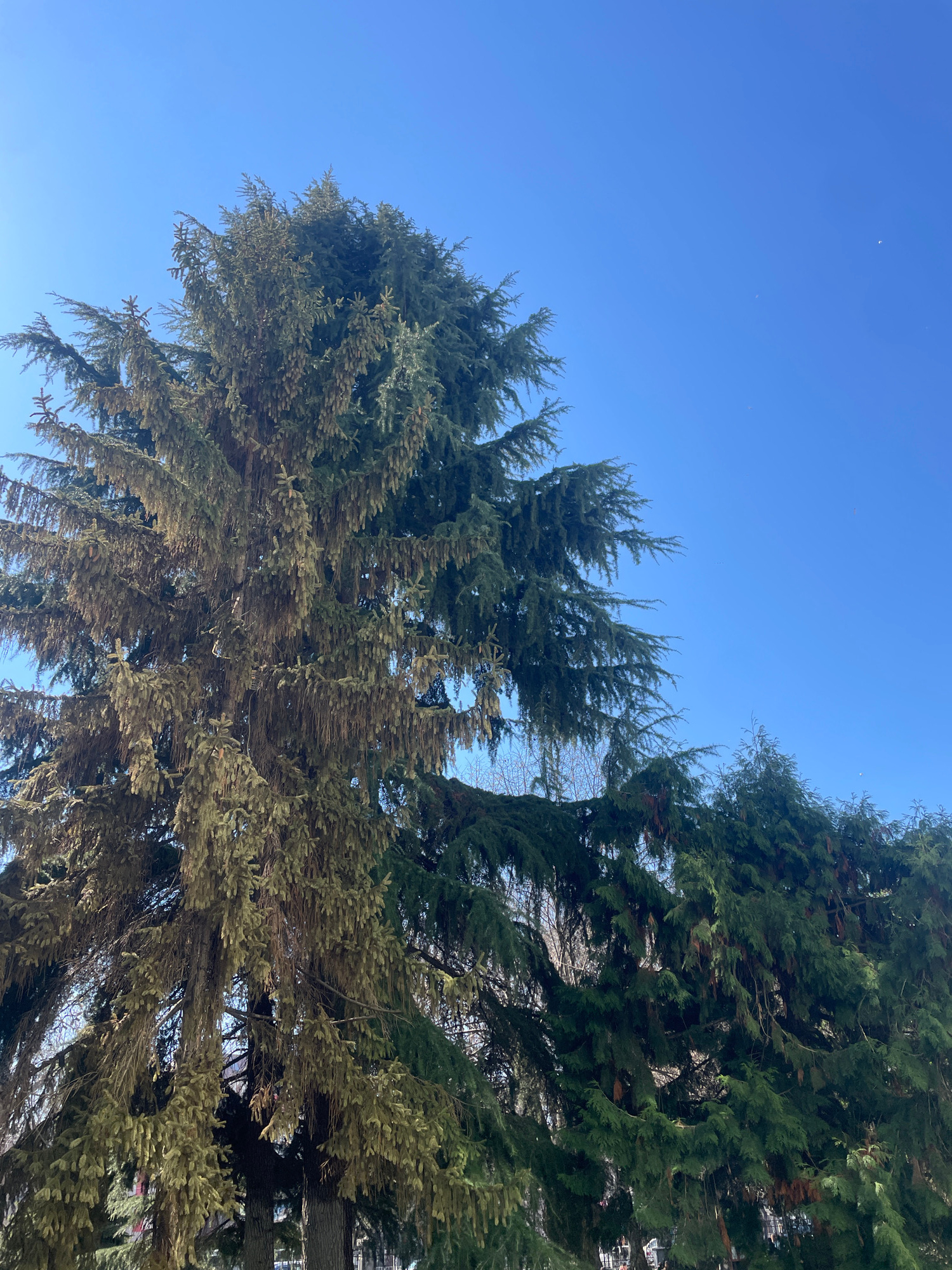 The image shows a low-angle view of two coniferous trees against a clear, blue sky. The trees are of different shades of green, with the one on the left appearing slightly yellowish-green and the one…read more