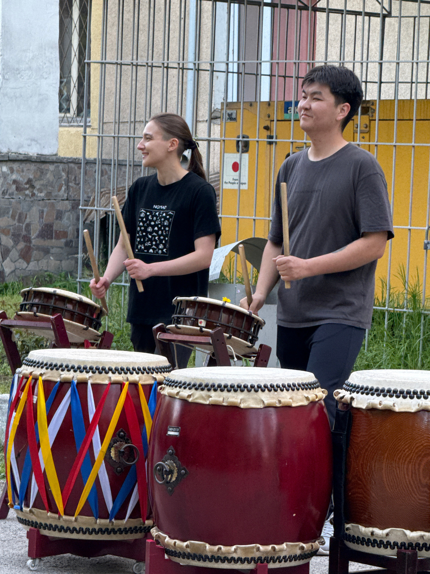 Two individuals, one man and one woman, are playing taiko drums. The man is wearing a grey t-shirt and dark pants, and the woman is wearing a black t-shirt with a design on it and dark pants. They are…read more