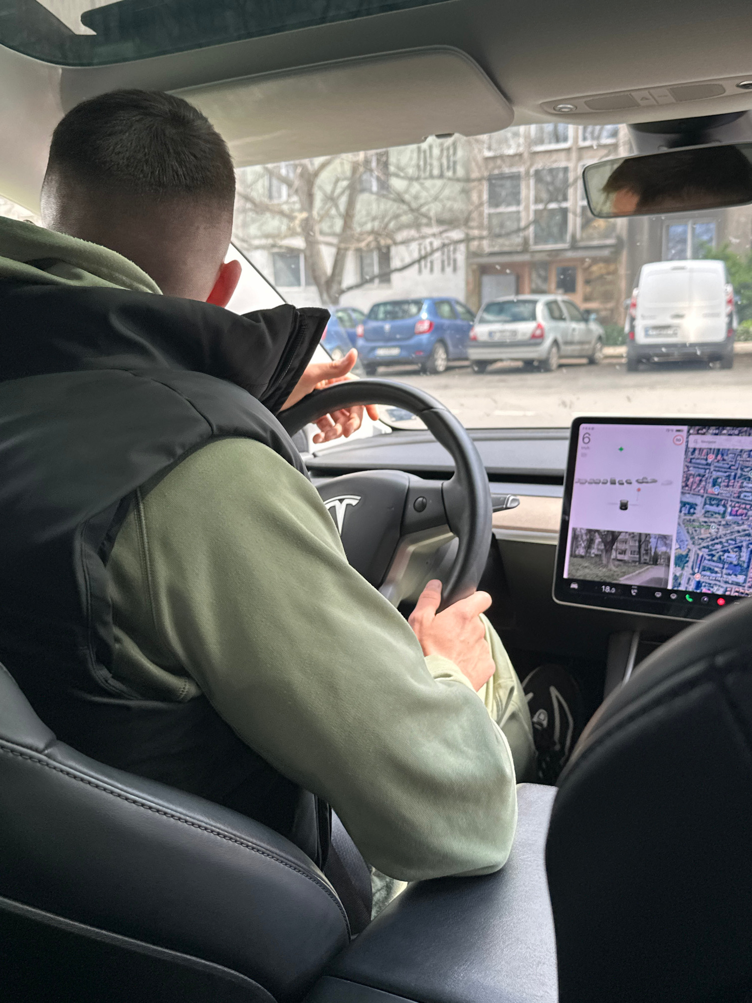 A person is driving a car in Stara Zagora, Bulgaria. The person is holding the steering wheel. The car has a navigation system displaying a map of the city. The car appears to be on a street with buil…read more