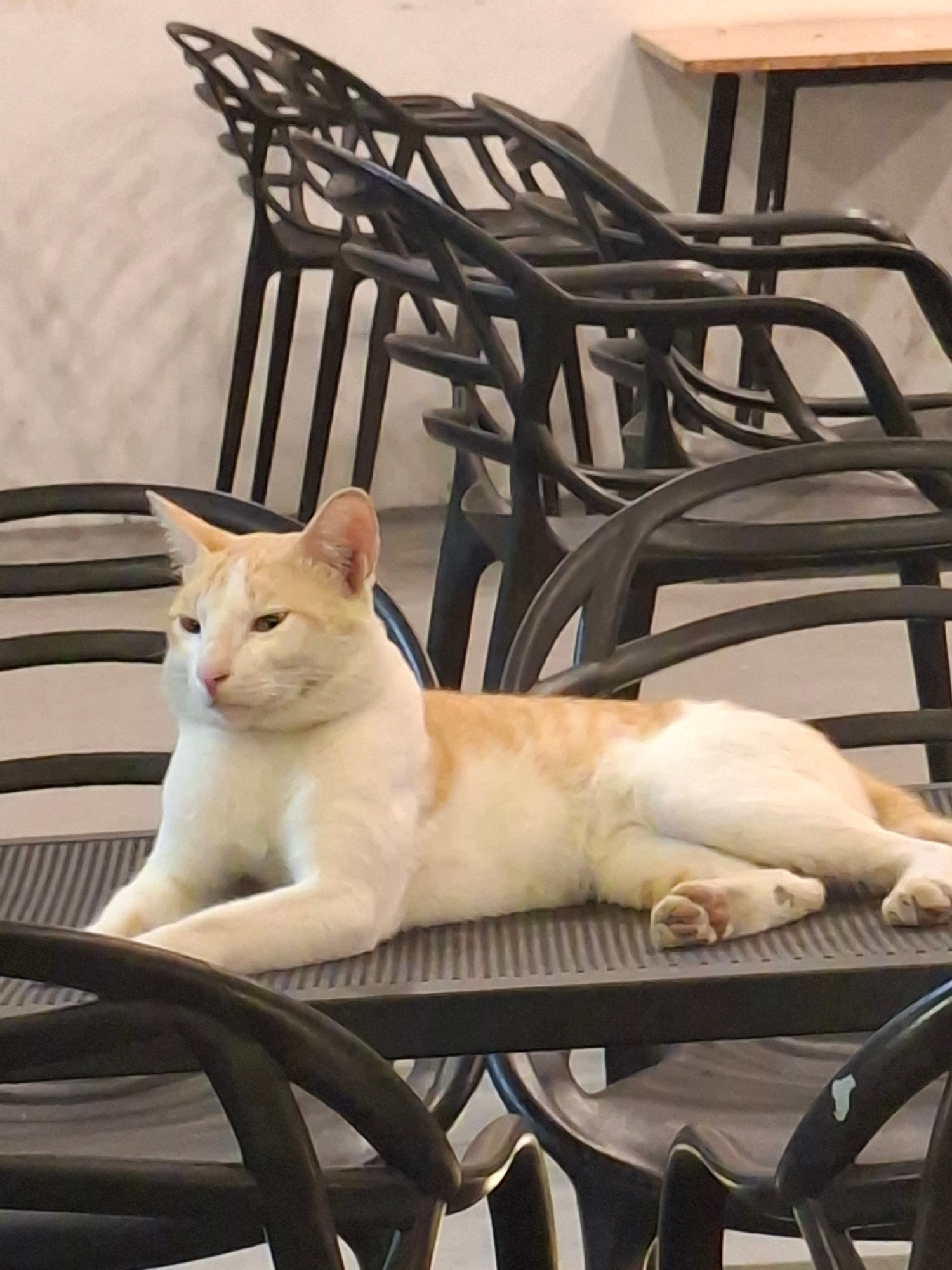 The image, rotated vertically, features a cream and light orange tabby cat resting on a stack of dark-colored chairs in Lhokseumawe, Indonesia. The cat is positioned with its back along the top of the…read more