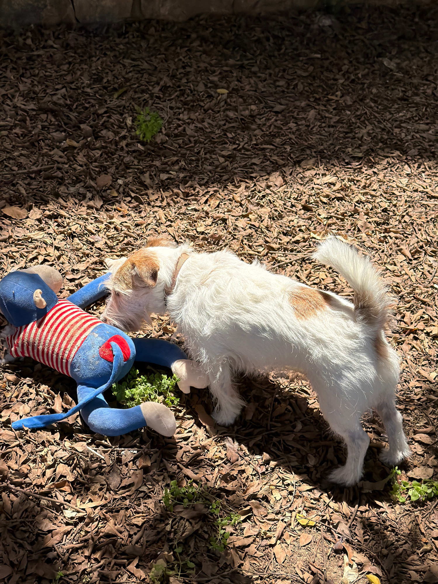 A Jack Russell Terrier dog is lying on a bed of dry leaves next to a blue and white striped plush toy. The location is outdoors with sunlight filtering through trees. There are no signs to indicate it…read more