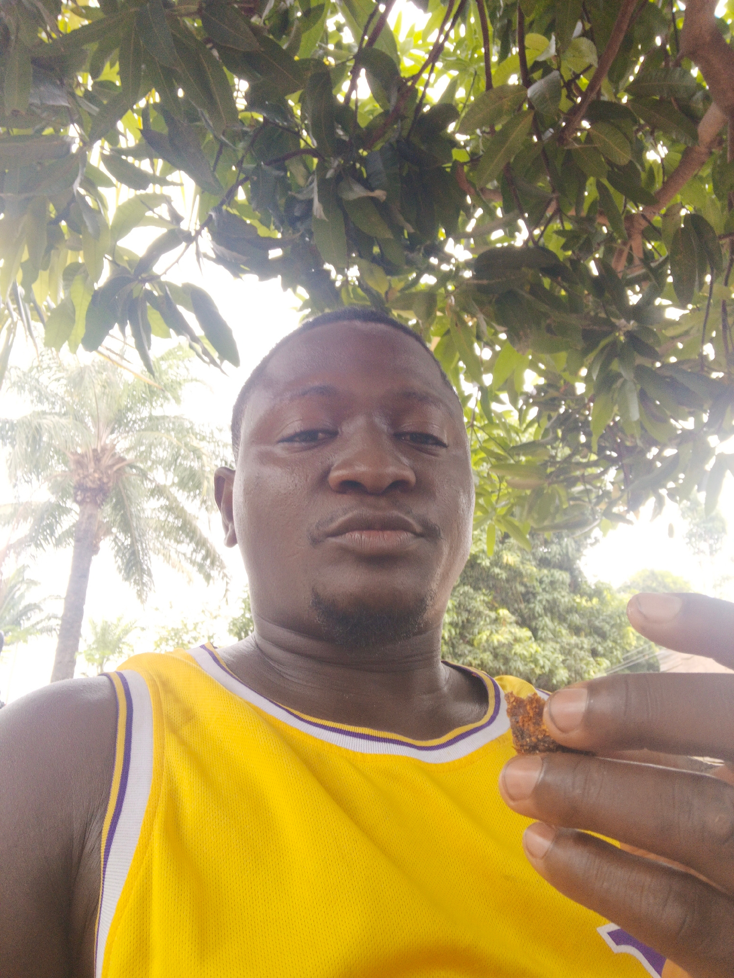 A close-up selfie of a man with dark skin and short dark hair, wearing a yellow Lakers jersey with white and purple trim. He is holding a small, brown, possibly food item between his fingers. Behind h…read more