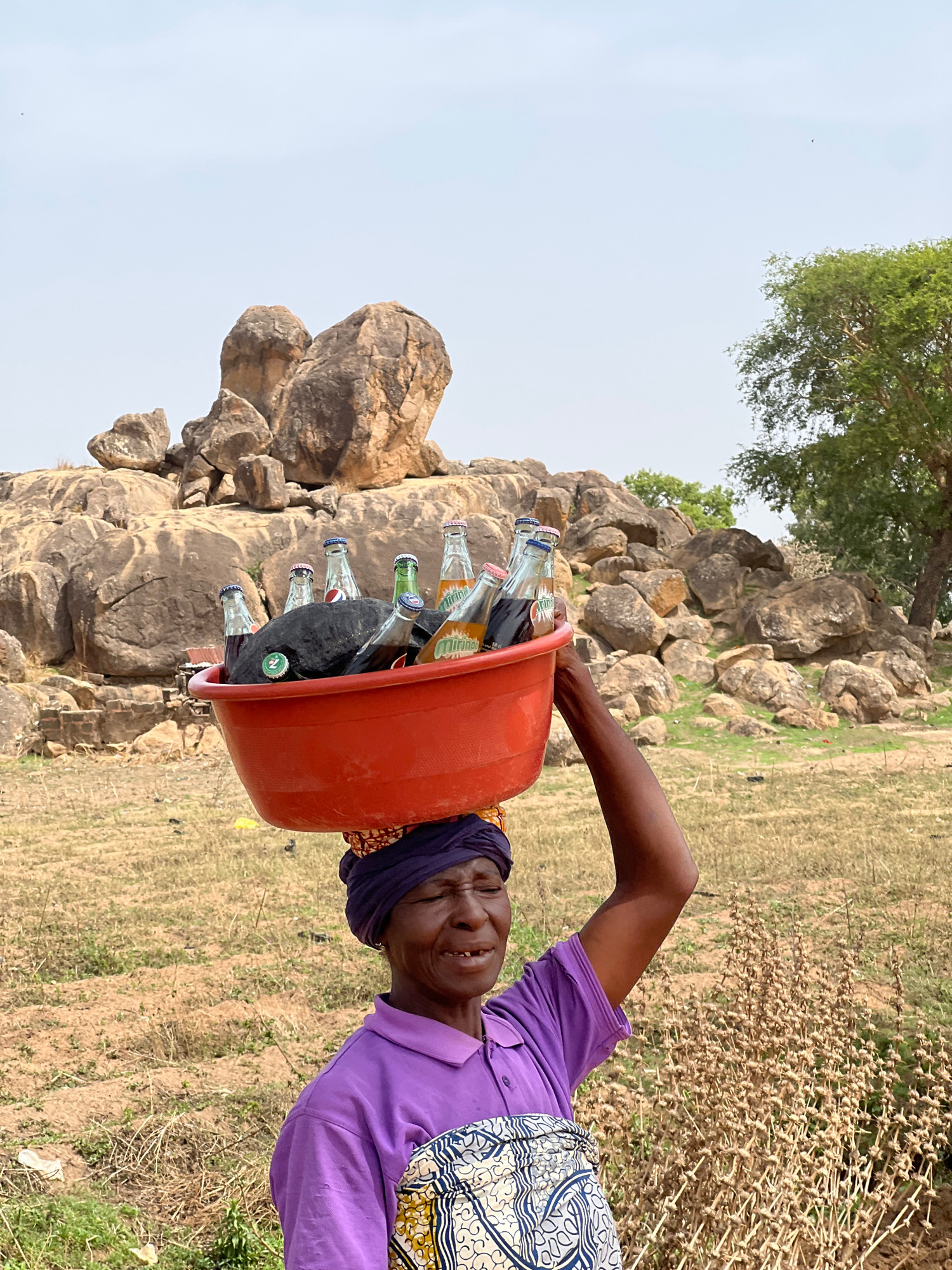 A woman is pictured outdoors, carrying a red tub full of glass bottles on her head. She is smiling, with her right arm raised. She is wearing a purple shirt, a dark-colored head wrap, and a patterned…read more
