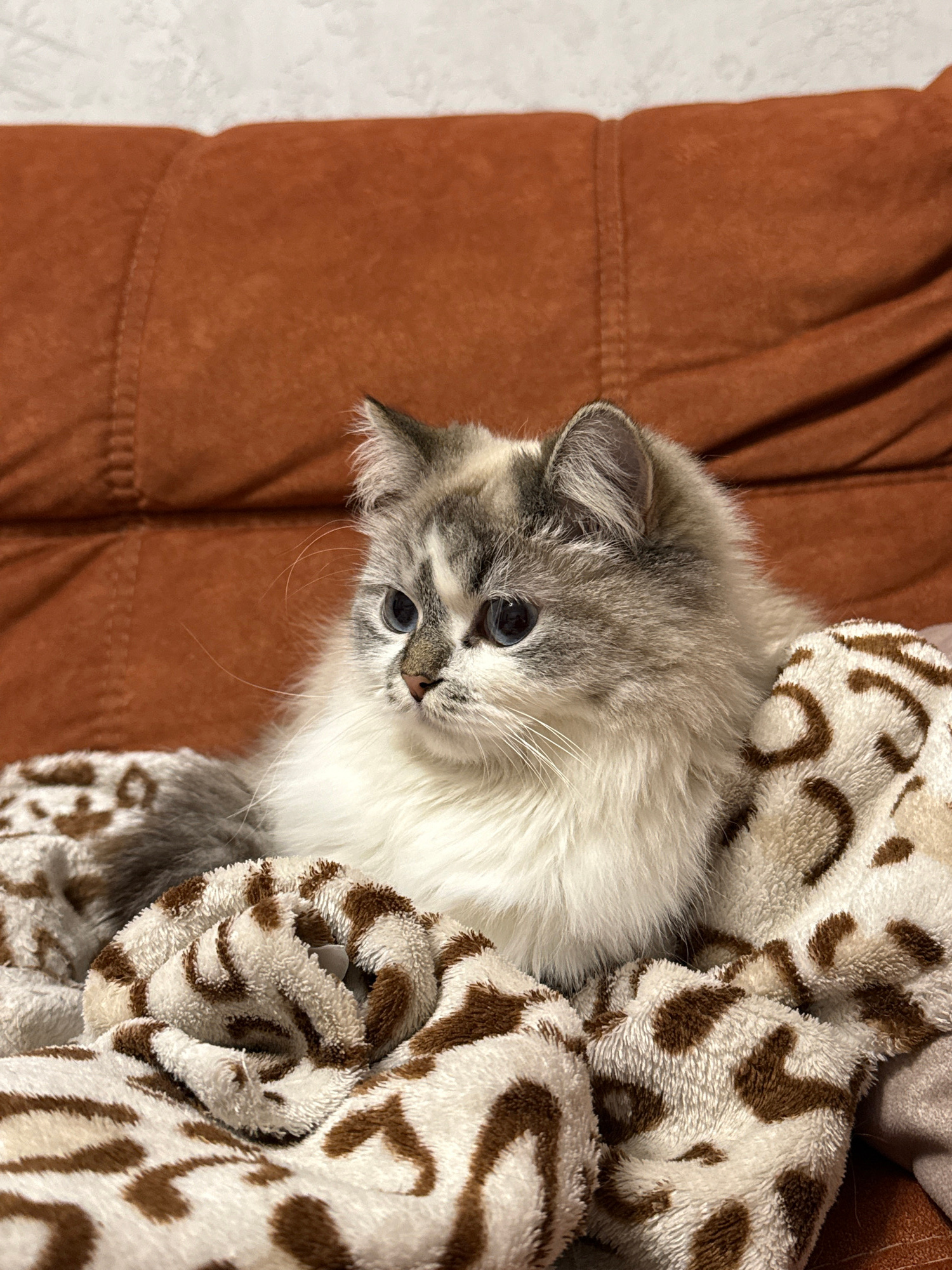 A fluffy gray and white kitten with blue eyes is nestled on a brown quilted cushion and wrapped in a white and brown patterned blanket. The kitten is looking to its left. This scene is likely in a res…read more