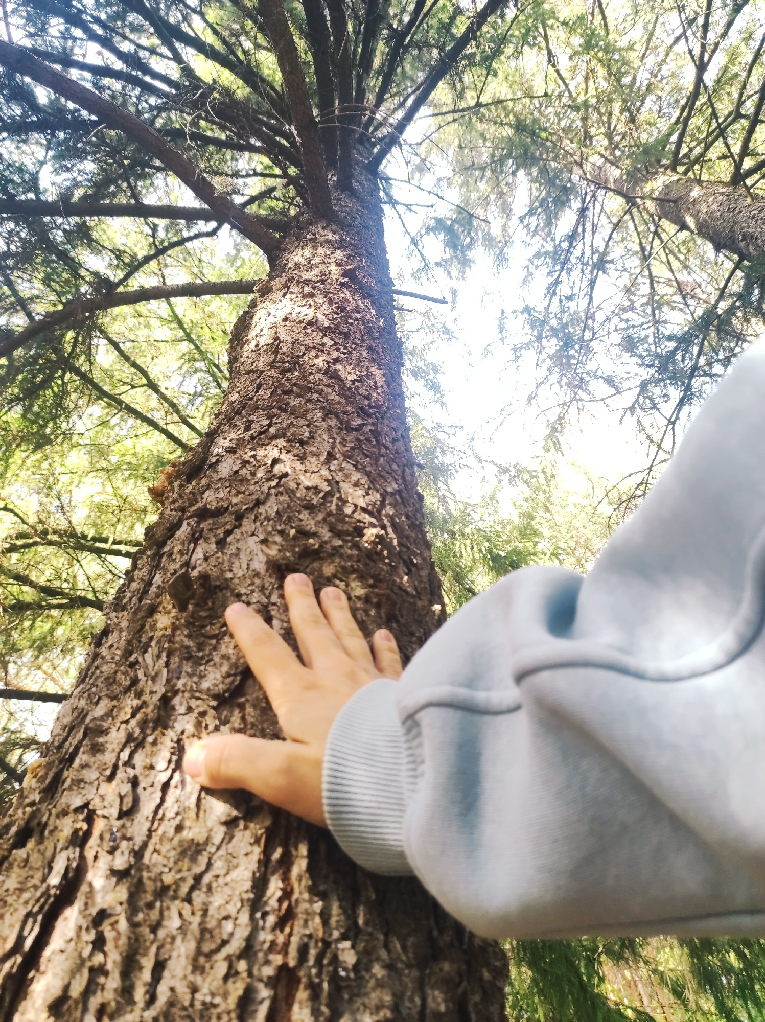 A person's hand rests on the trunk of a tall tree, its bark rough and textured, rising upwards into a canopy of branches against a bright, partly cloudy sky. The person is wearing a light blue hooded…read more